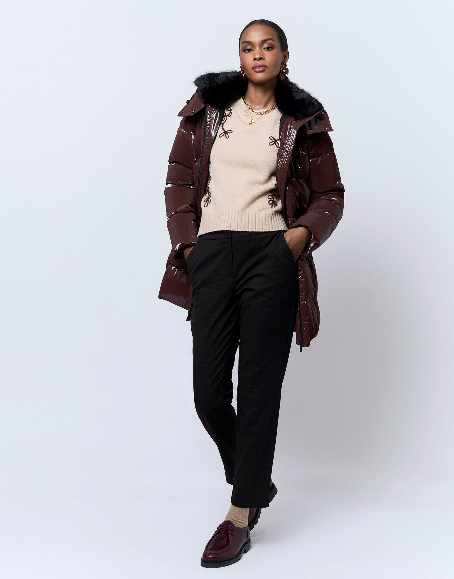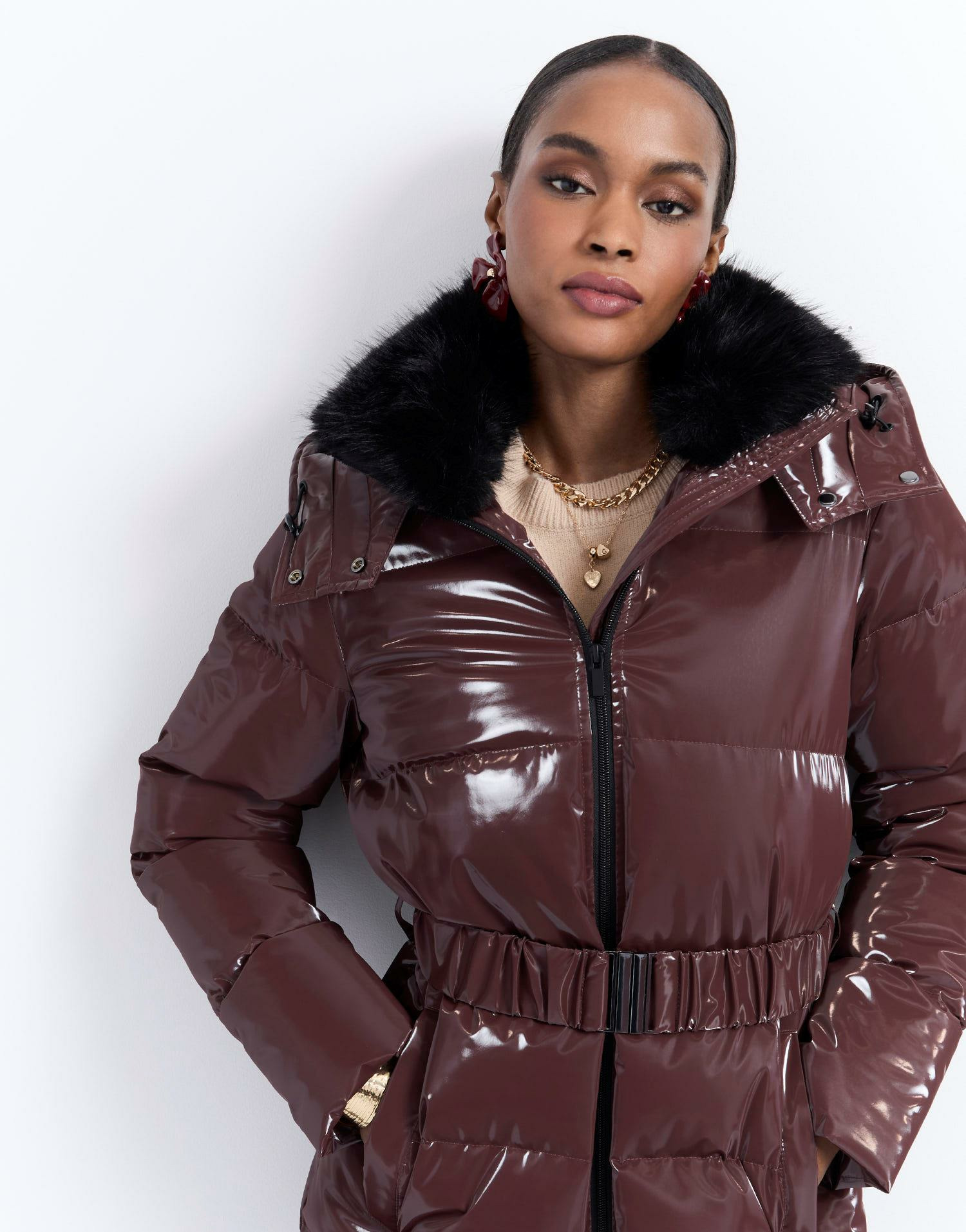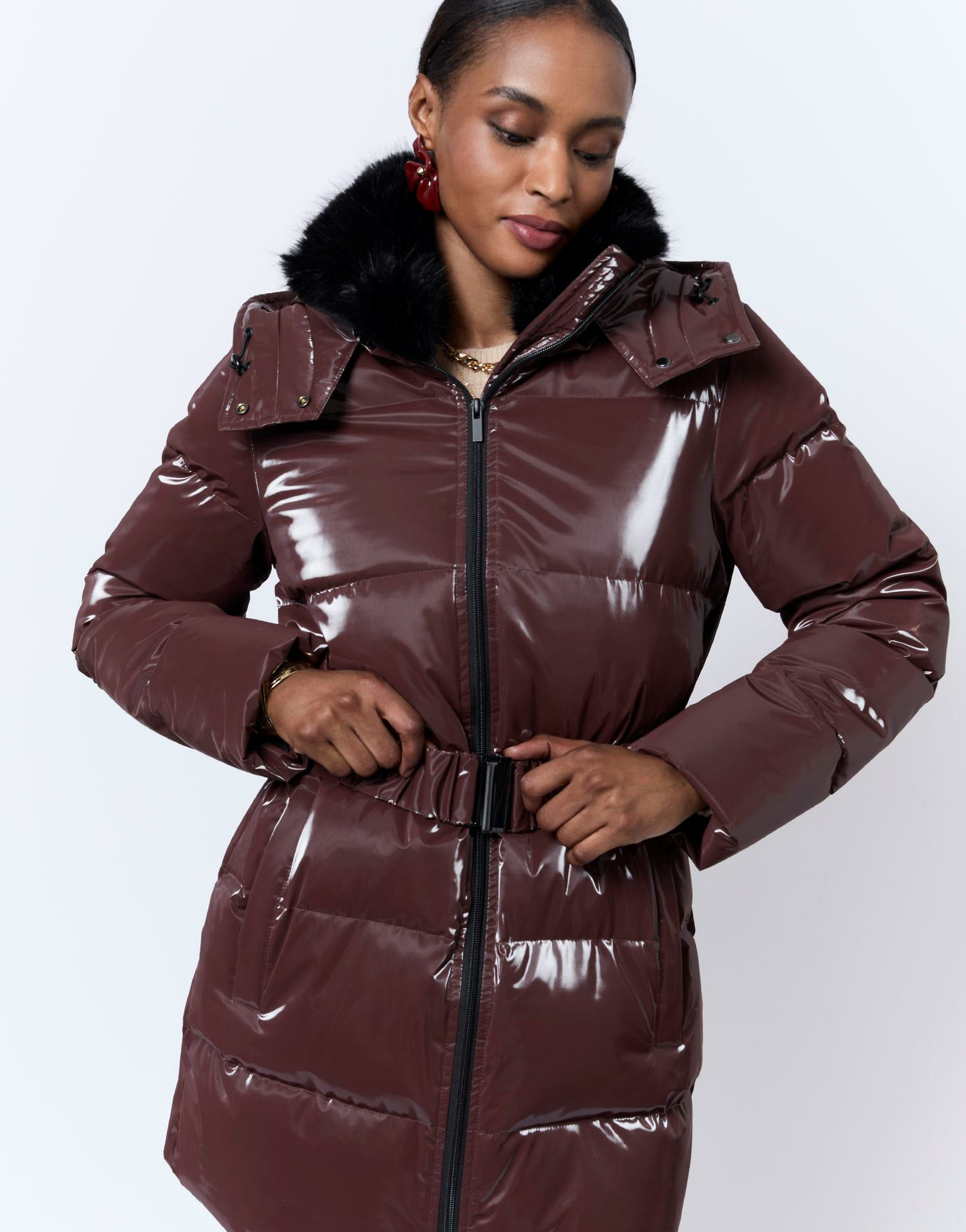 Longueur : 80 cm. Col en fausse fourrure. Matière extérieure vinyle brillant. Coupe ajustée. La mannequin mesure 1m75 et porte une taille 38.