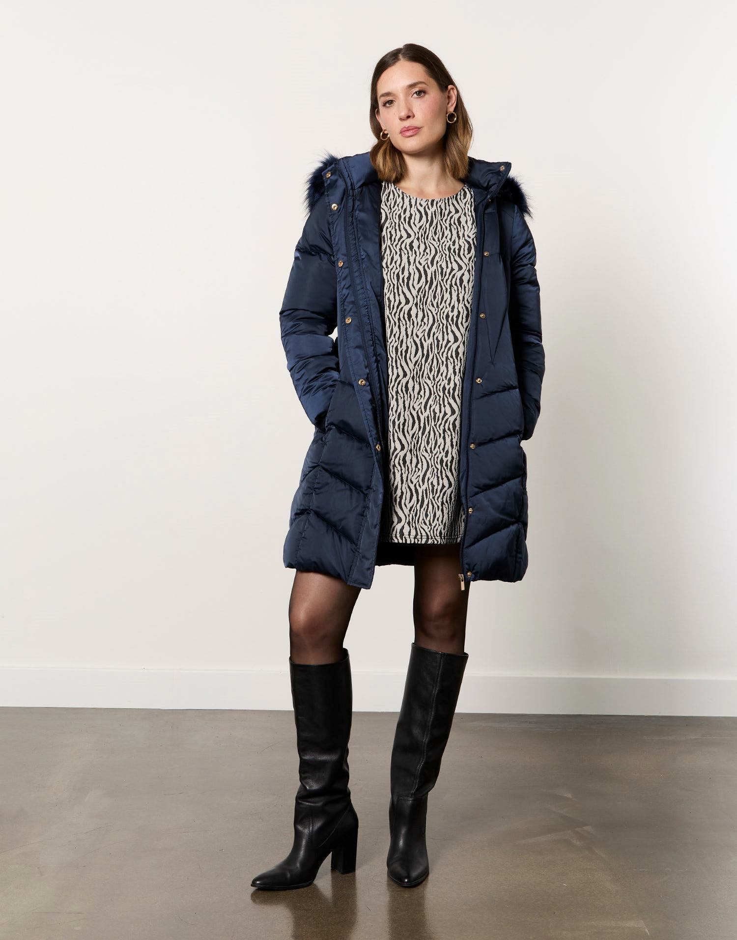 Affrontez l’hiver avec élégance grâce à cette doudoune mi-longue unie marine signée RIU Paris. Sa coupe ajustée et sa capuche à fourrure apportent une touche sophistiquée à votre tenue tout en vous protégeant du froid.