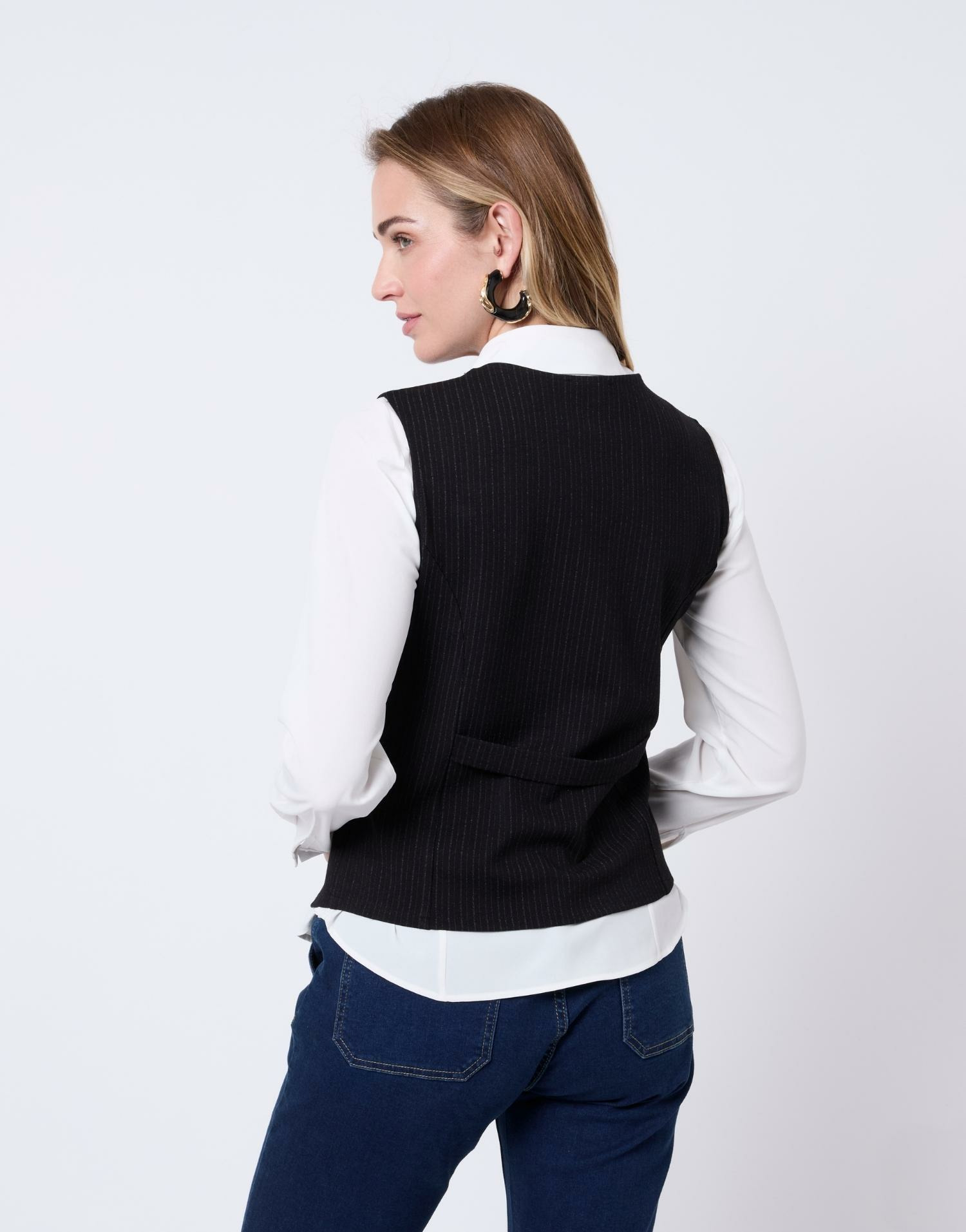 Ce gilet barman sans col se distingue par sa coupe courte et ses rayures noires élégantes, rehaussé d’un détail subtil à l’arrière qui affirme son style unique. Fermé par des boutons à l’avant, il s’adapte parfaitement à une silhouette moderne, apportant une touche structurée et tendance à vos tenues du quotidien comme à vos ensembles plus sophistiqués.