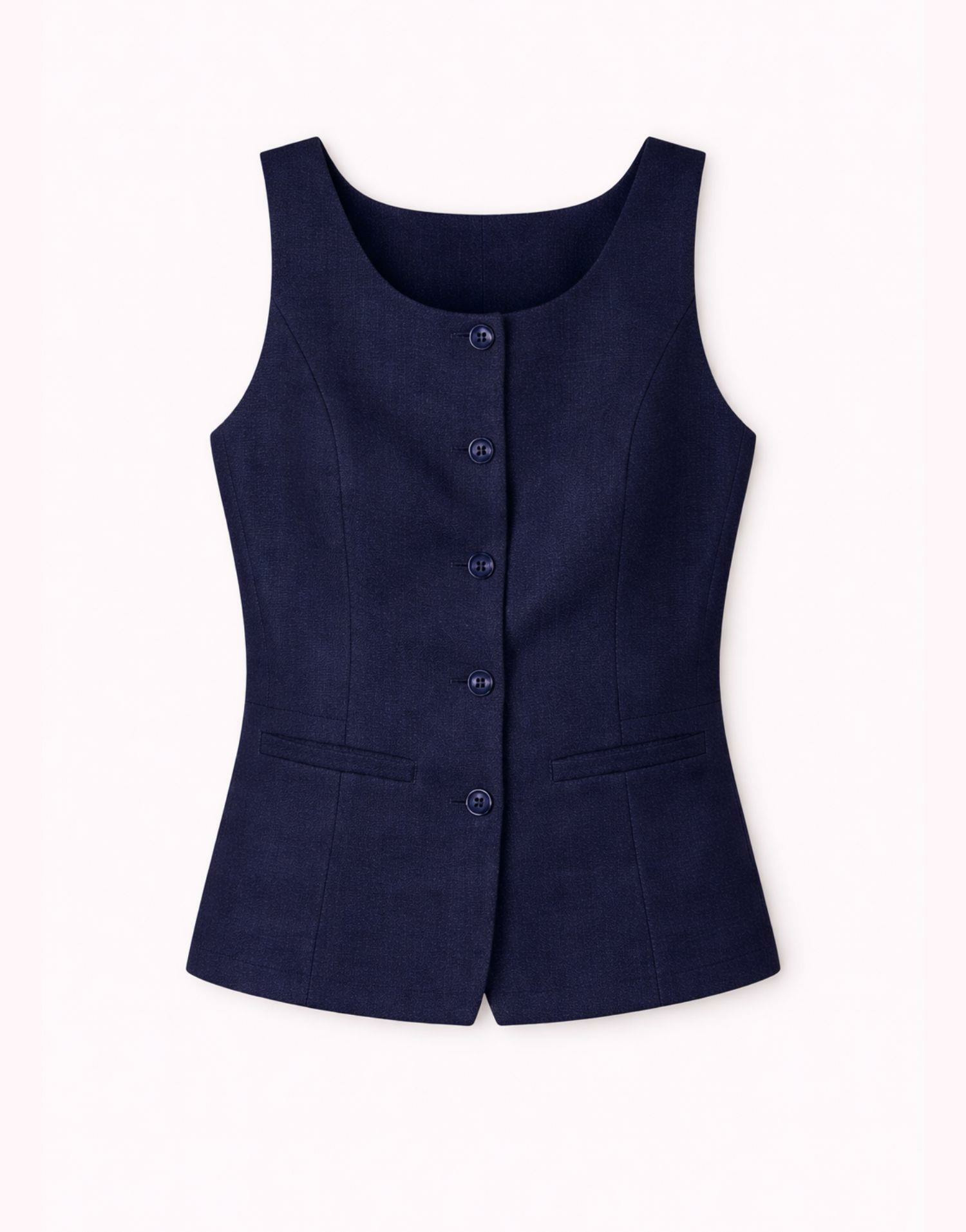 Confectionné en faux denim, ce gilet sans manches apporte une touche contemporaine à vos looks, tout en restant léger et facile à porter. L’encolure arrondie et la fermeture boutonnée sur le devant soulignent une esthétique soignée, tandis que les poches discrètes ajoutent une note pratique sans compromettre l’élégance. Parfait pour superposer sur une chemise ou un pull fin, il complète vos tenues avec finesse et caractère.