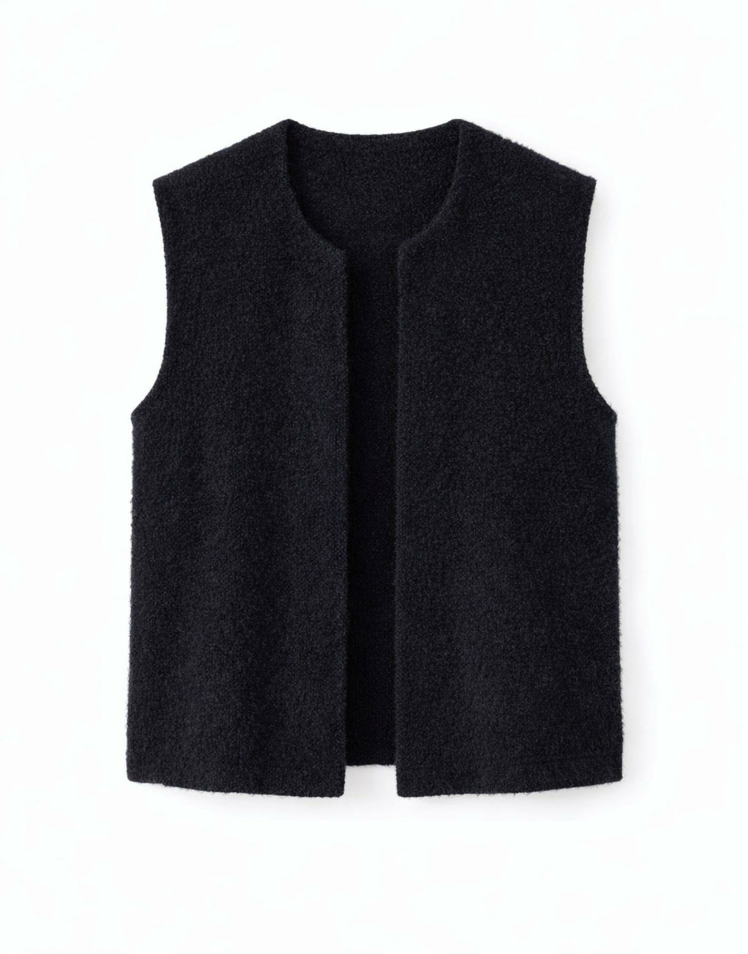 Confectionné sans manches avec une encolure arrondie, ce gilet court s’impose par sa simplicité raffinée. Il se porte seul pour une allure nette ou superposé pour structurer et affiner la silhouette, apportant une touche moderne et versatile à votre dressing. Son design sobre s’adapte à toutes les occasions, offrant un équilibre parfait entre confort et style.