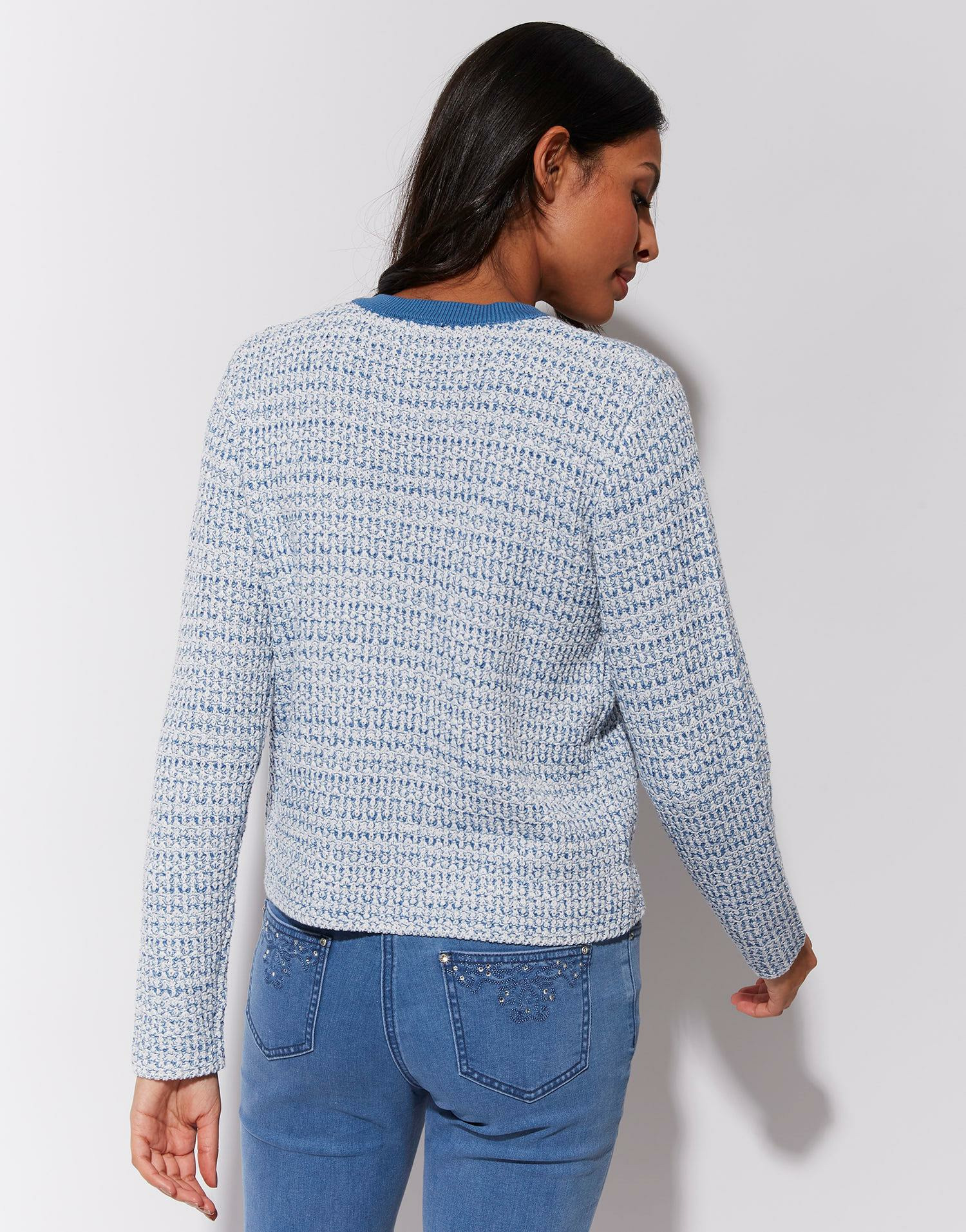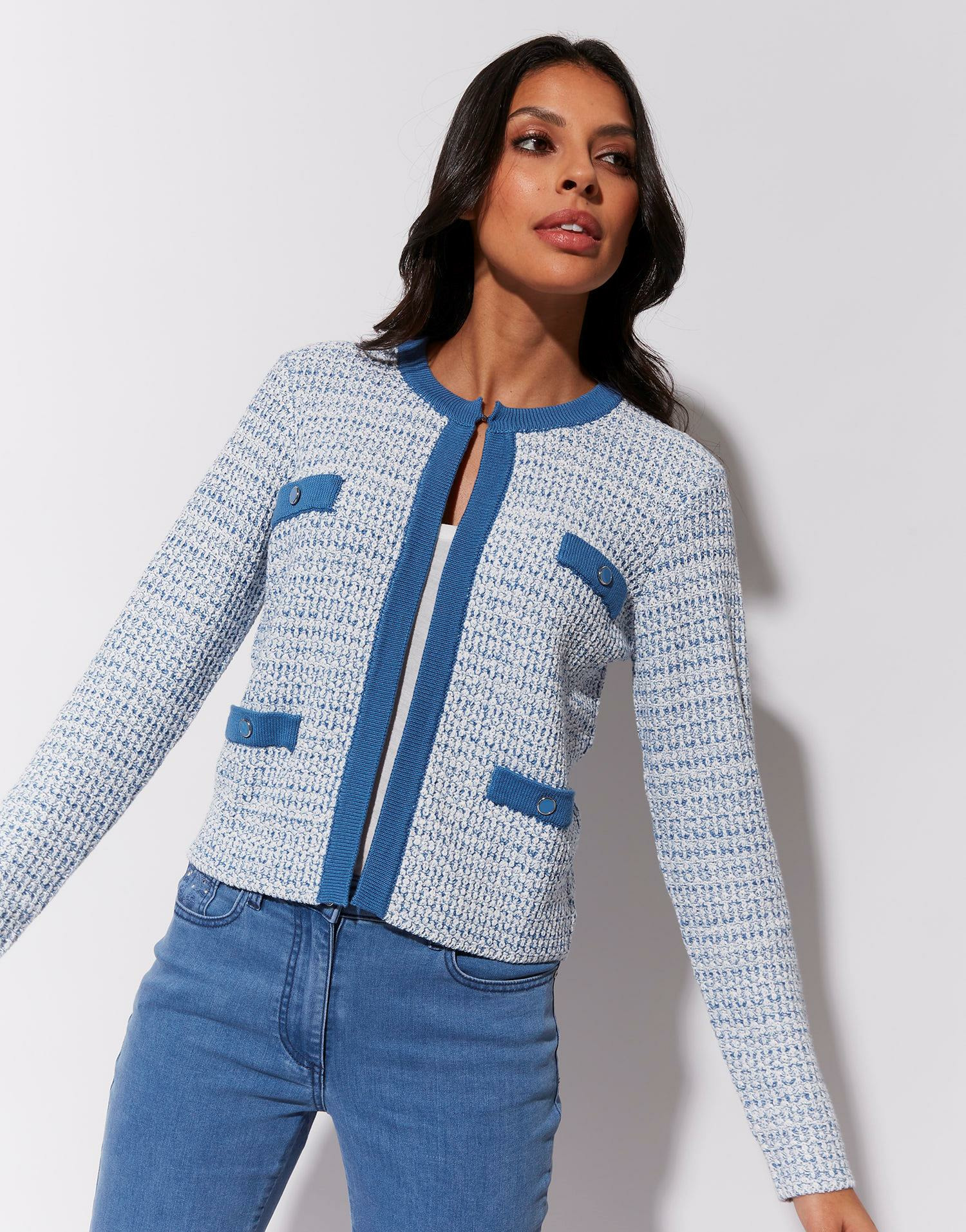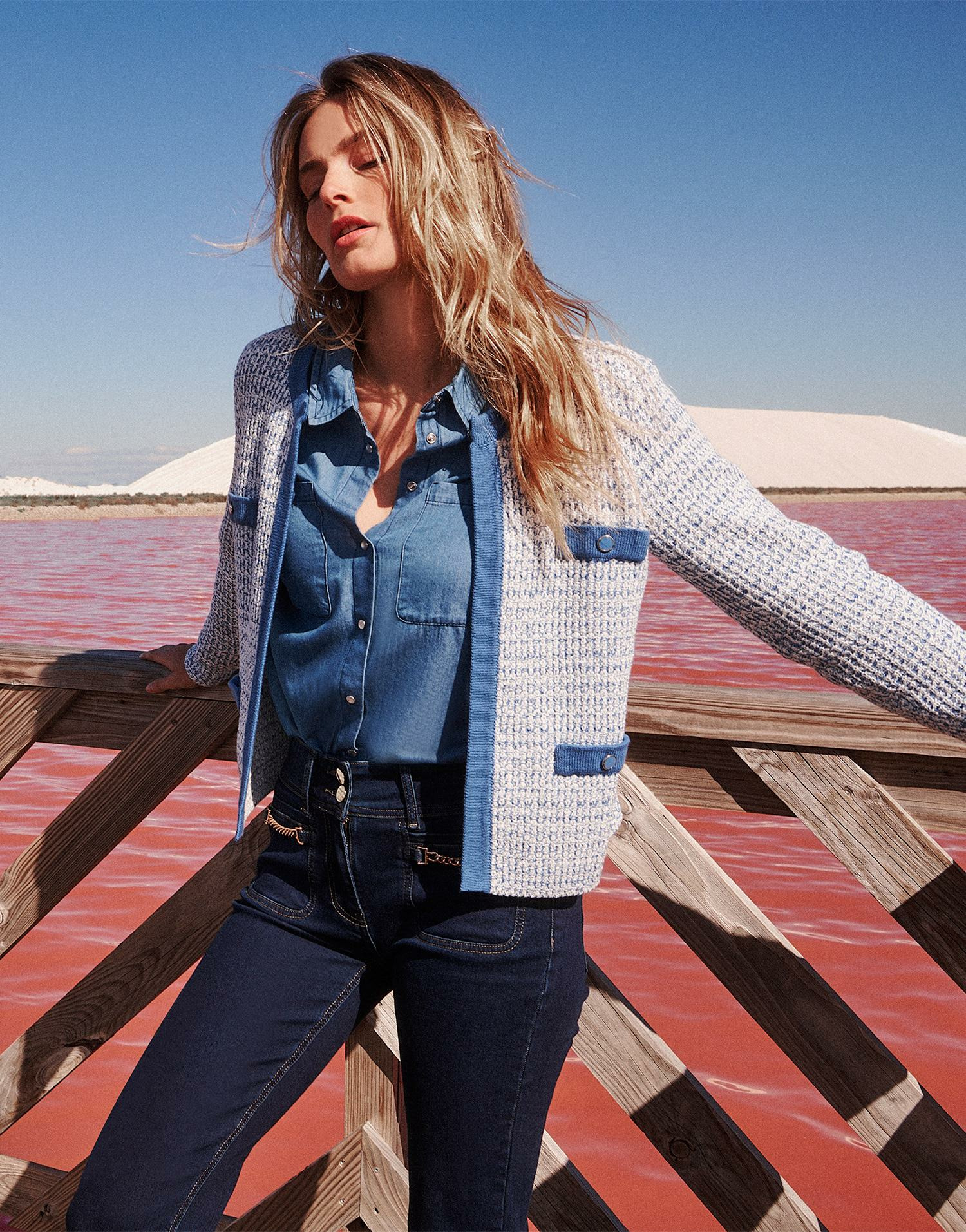 Adoptez l’élégance intemporelle avec ce gilet jacquard bleu signé RIU Paris. Un essentiel chic qui sublime instantanément votre silhouette.