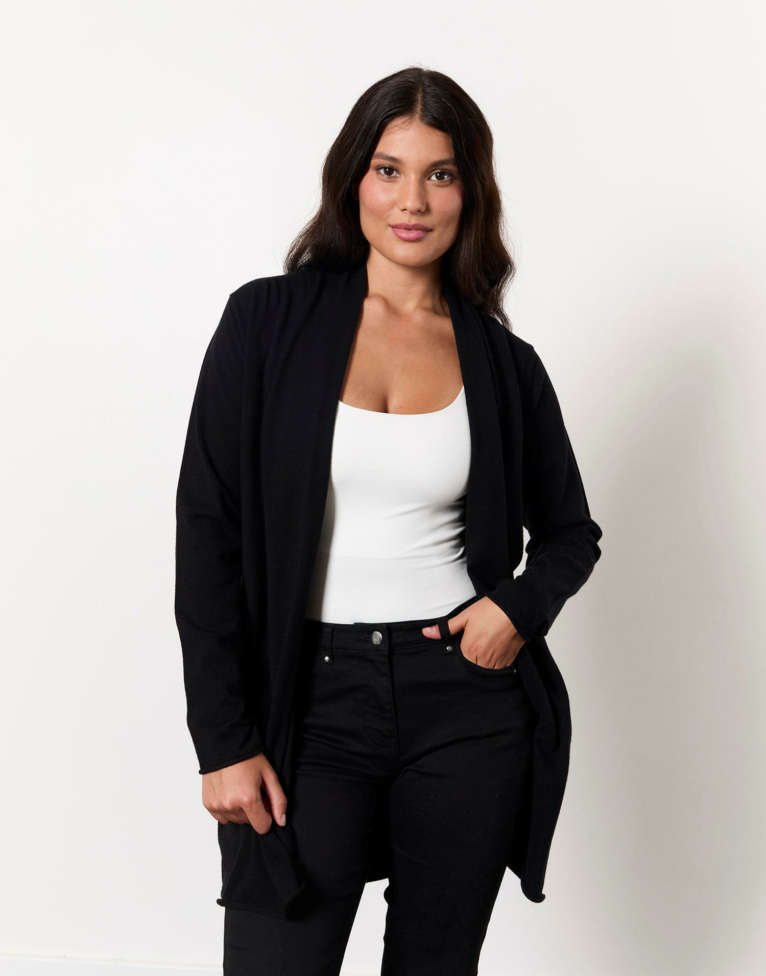 Fabriqué avec des matériaux de qualité, ce gilet long noir présente un col châle élégant et des manches longues qui garantissent confort et chaleur. Sa longueur généreuse assure une protection optimale contre les courants d’air tout en affinant la silhouette.