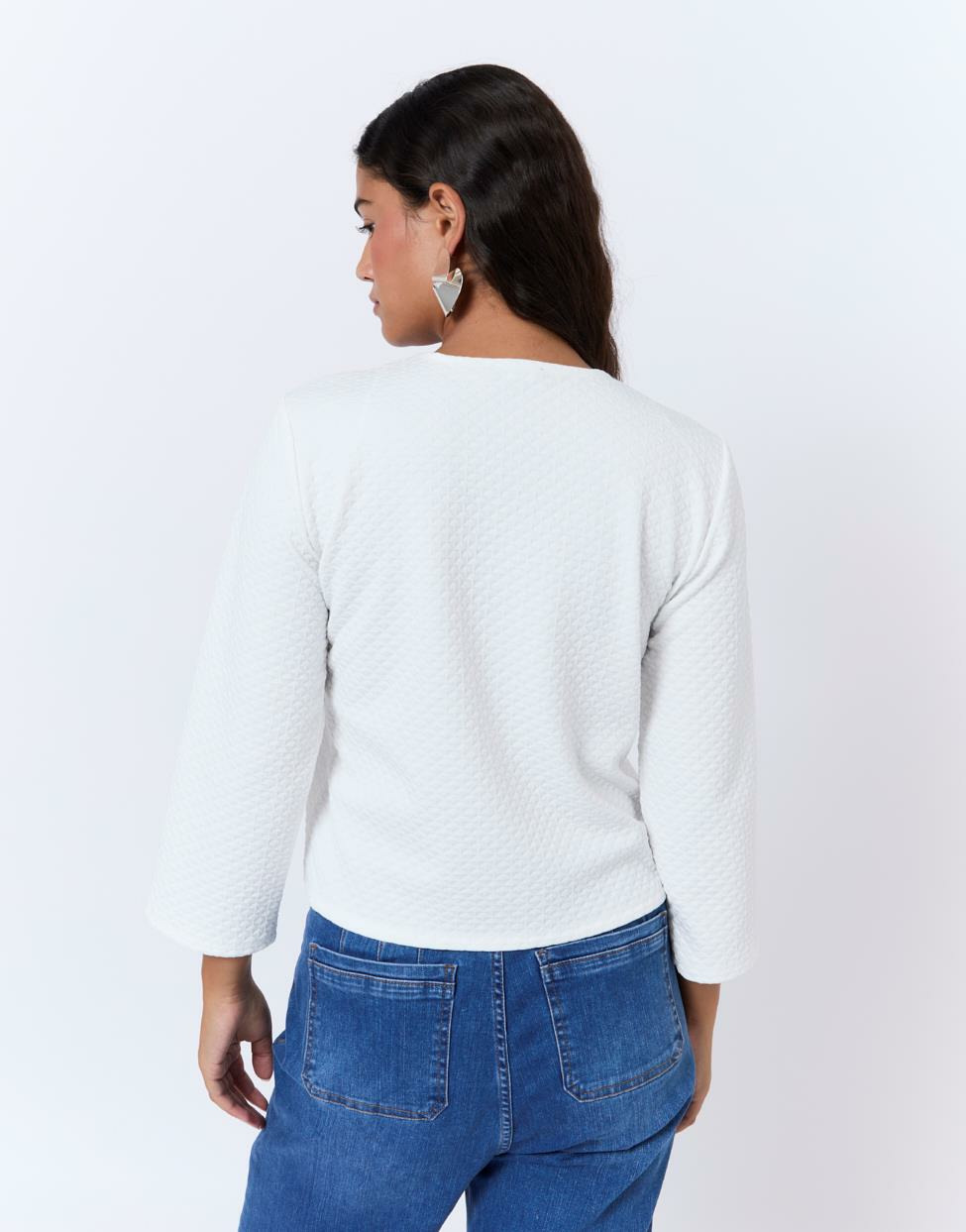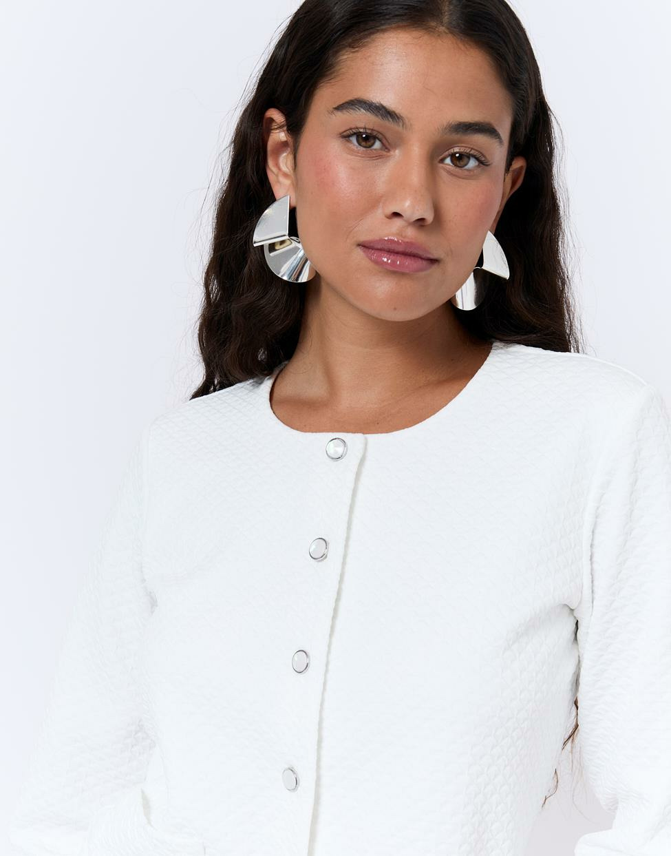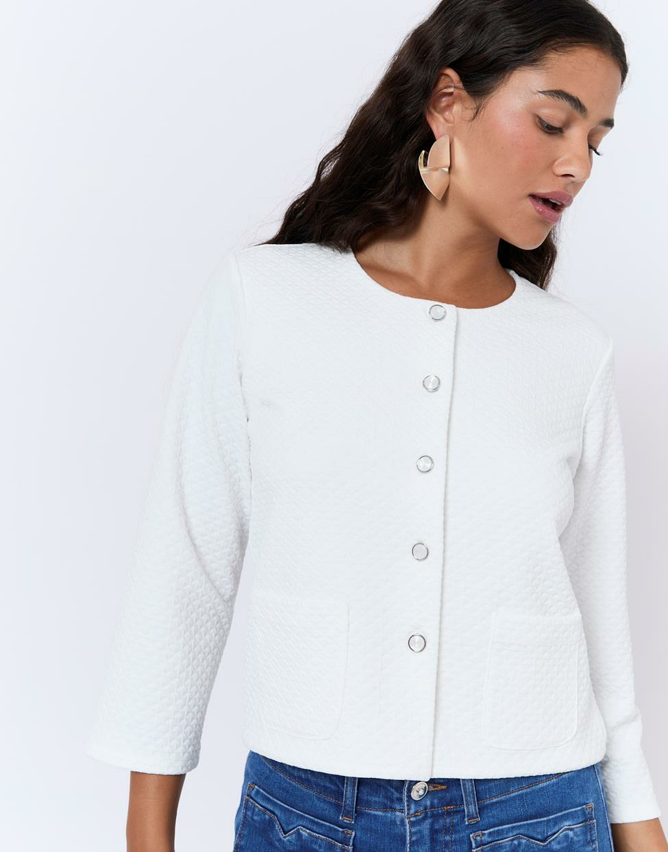 Fabriqué avec soin, ce gilet court présente un effet matelassé élégant, des manches trois-quarts pratiques et des boutons nacrés qui assurent une fermeture raffinée. Sa teinte blanche pure s’intègre aisément à votre garde-robe.