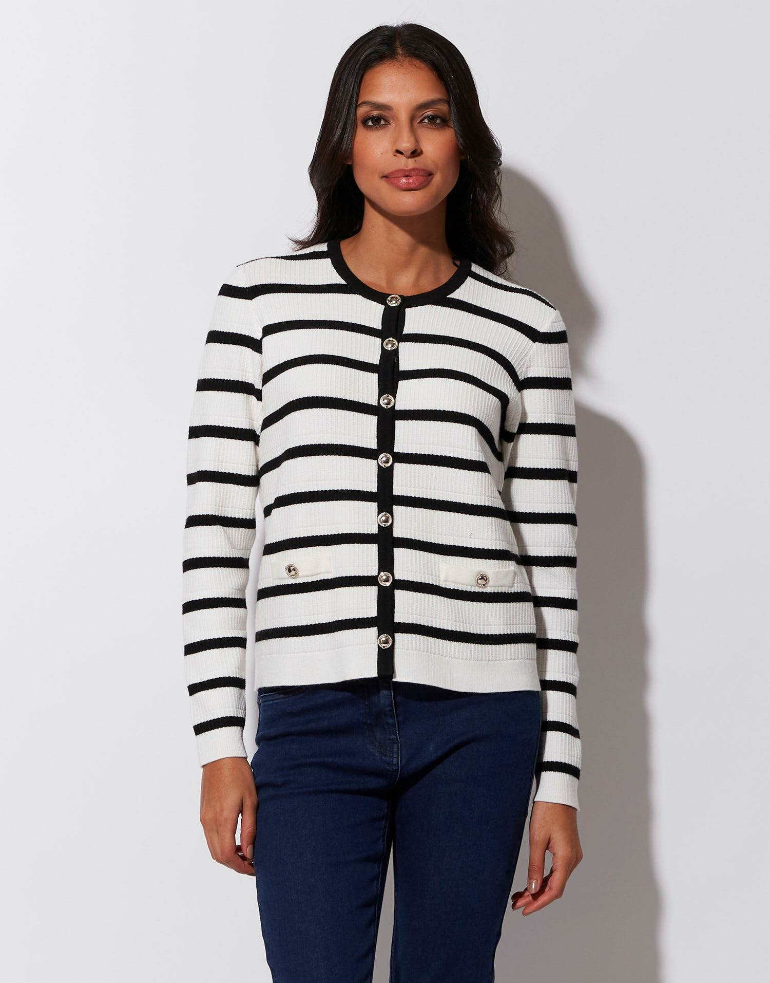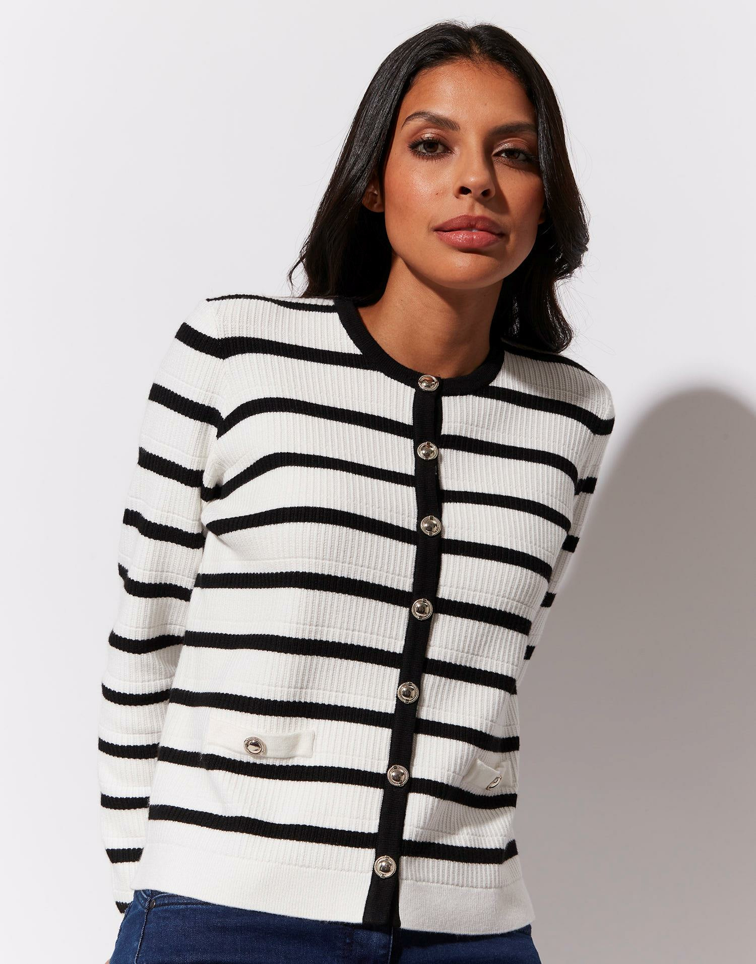 Ce cardigan à rayures noires incarne le chic décontracté. Son col rond et sa fermeture à boutons apportent une finition soignée, idéale pour composer des looks variés, du jean casual à la jupe plus sophistiquée. Léger mais chaud, il accompagne vos journées fraîches avec confort et raffinement.