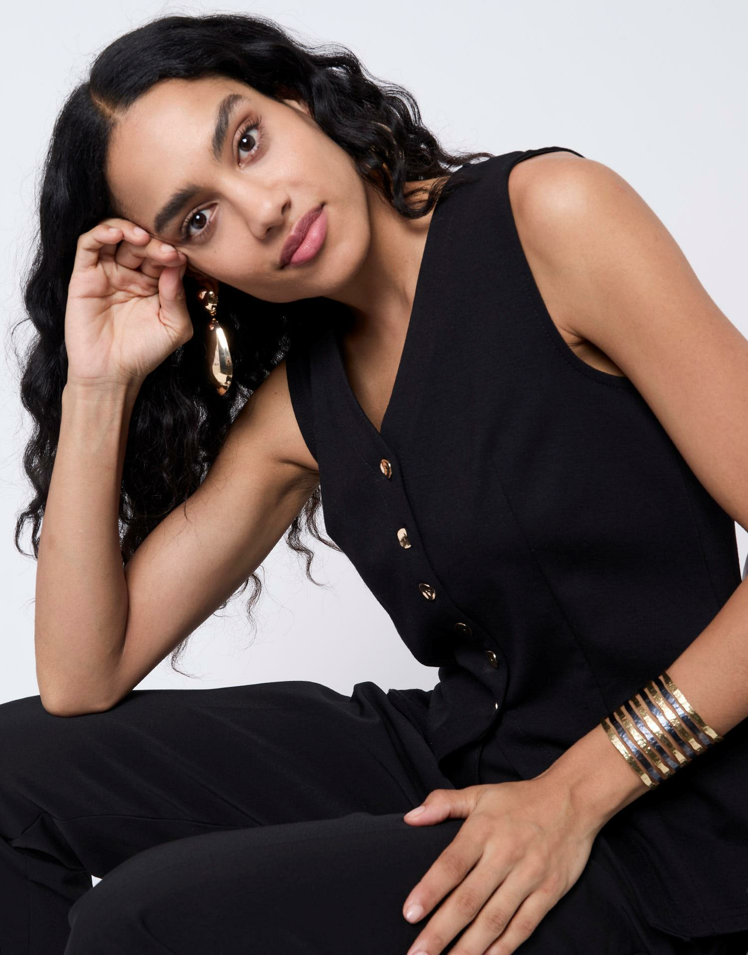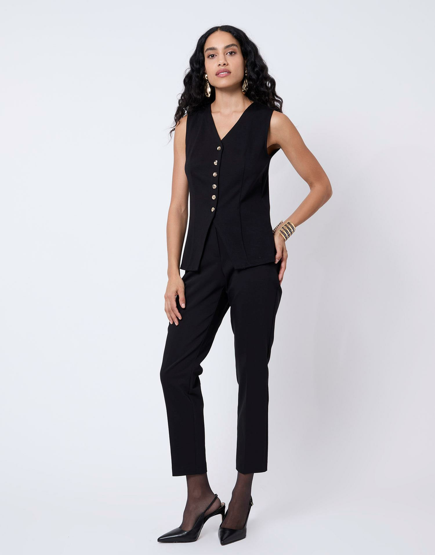 Ce gilet vous garantit une silhouette affinée et un style soigné sans effort. Son design épuré facilite les associations, tandis que les boutons dorés apportent une touche chic qui rehausse instantanément votre tenue. Une pièce incontournable pour celles qui recherchent élégance et modernité dans un même vêtement.