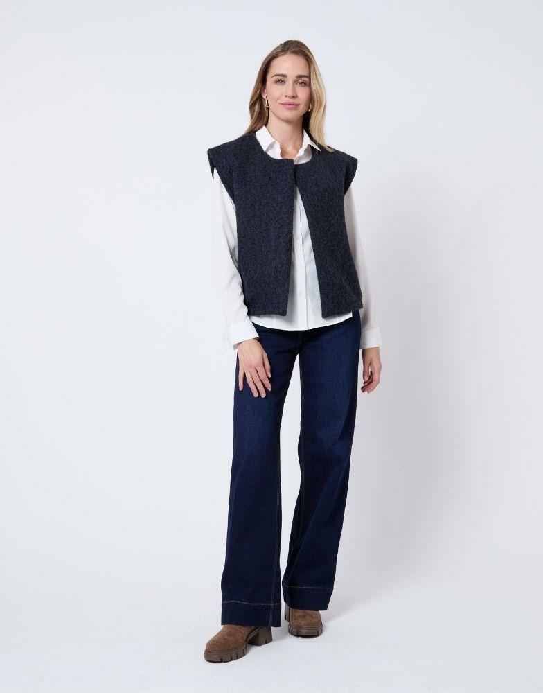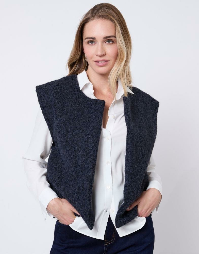 Conçu pour vous offrir chaleur et liberté de mouvement, ce gilet est un allié quotidien qui s’adapte à toutes les occasions. Sa texture laine bouclette garantit une sensation agréable sur la peau, tandis que sa teinte marine s’associe aisément à vos basiques et pièces fortes.