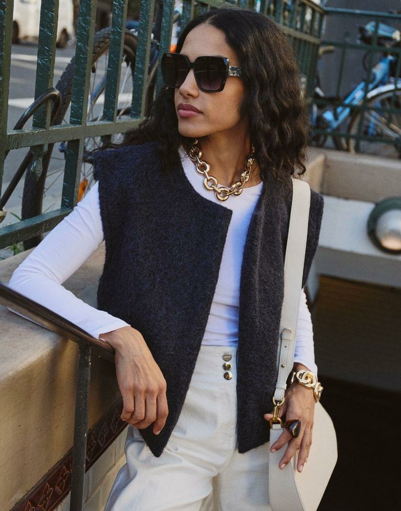 Ce gilet sans col se porte facilement du 38 au 42 grâce à sa taille unique adaptable, idéale pour varier les silhouettes selon vos envies. Léger mais chaud, il accompagne aussi bien vos tenues casual que vos ensembles plus sophistiqués, apportant une touche moderne et raffinée à votre garde-robe. Shahed mesure 1m75 et illustre parfaitement la fluidité de sa coupe.