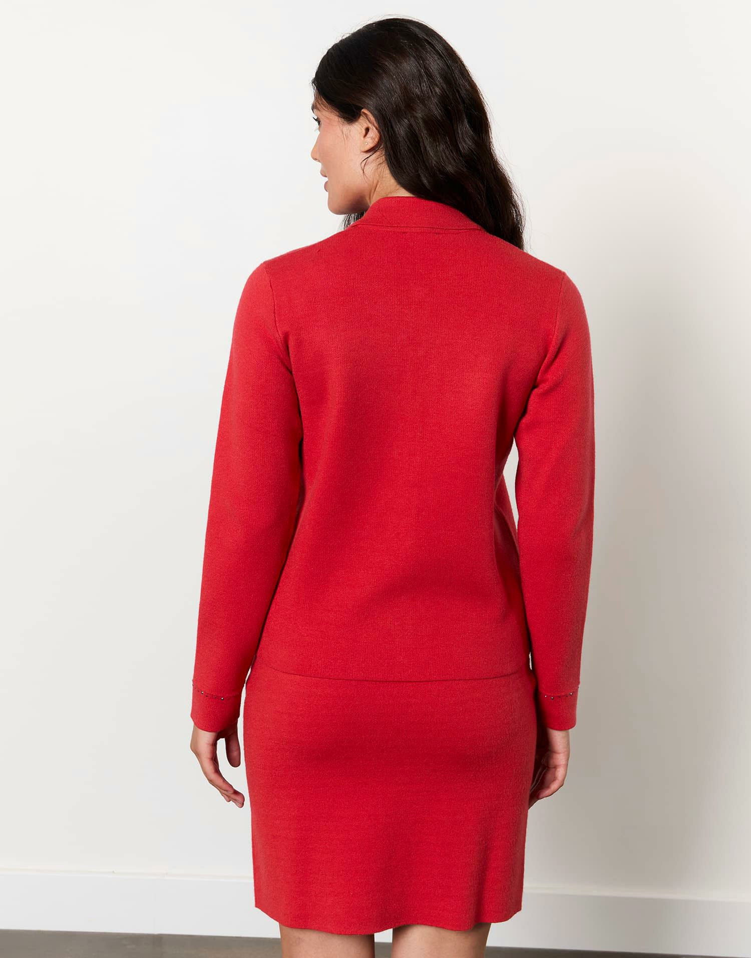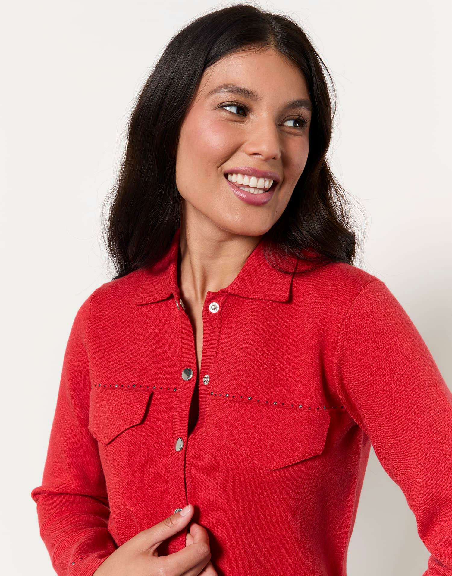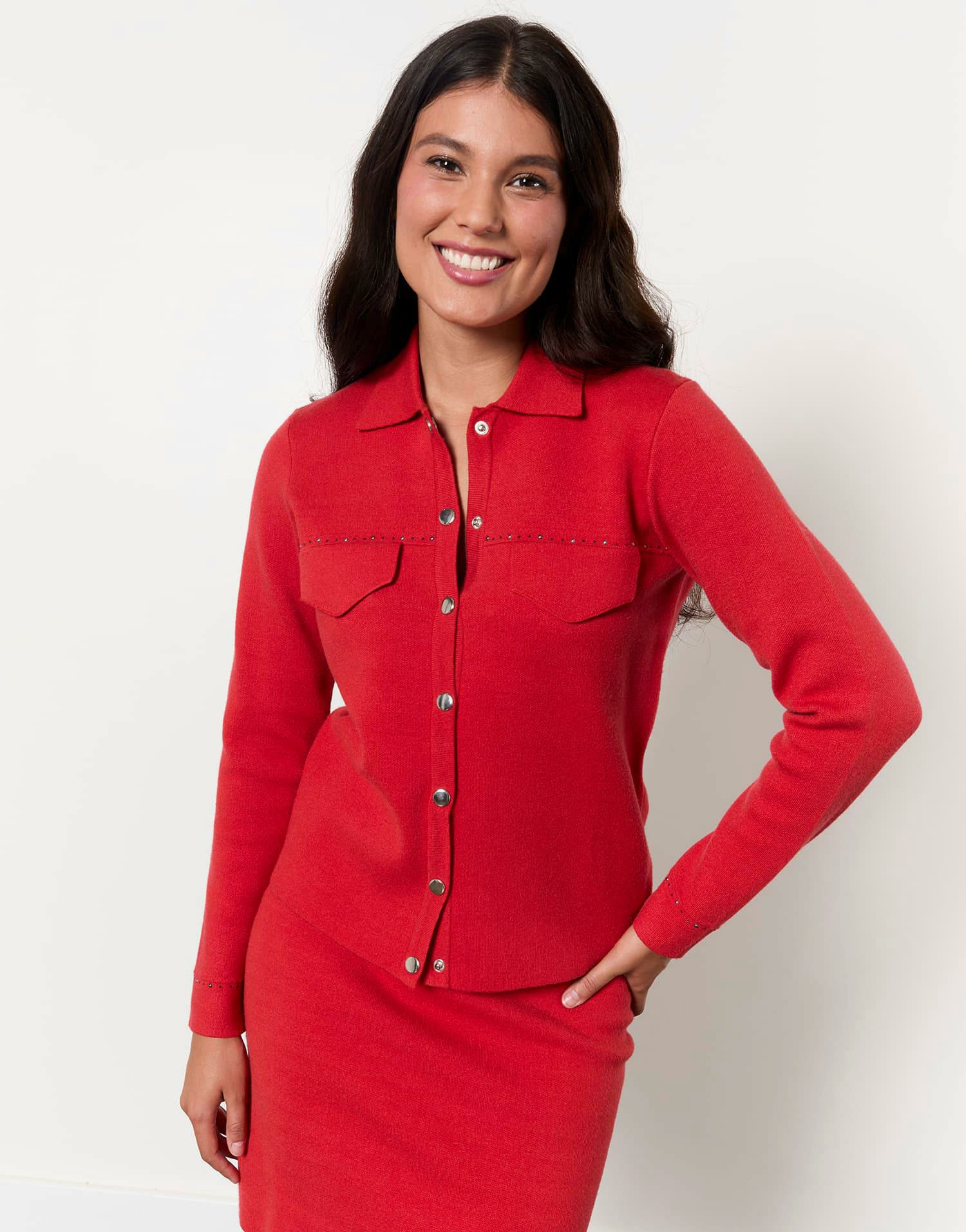 Fabriqué dans une matière élégante, ce gilet présente un col chemisier structuré, des boutons pression discrets et des détails en strass. Louna mesure 1m73 et porte une taille 01. Disponible en rouge et noir.