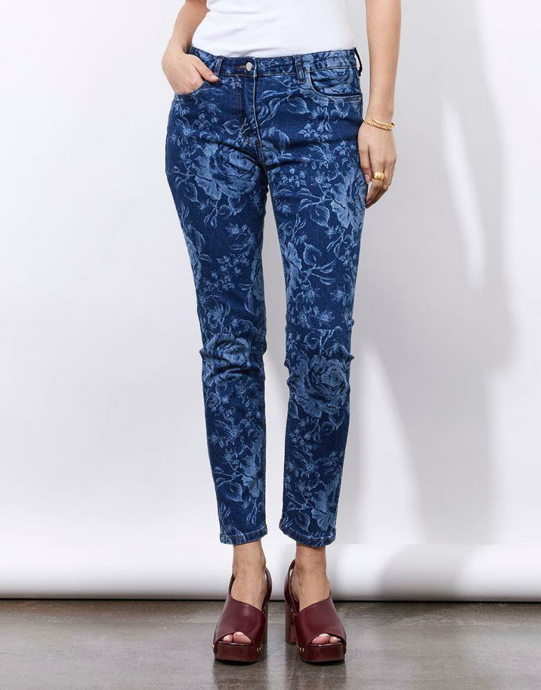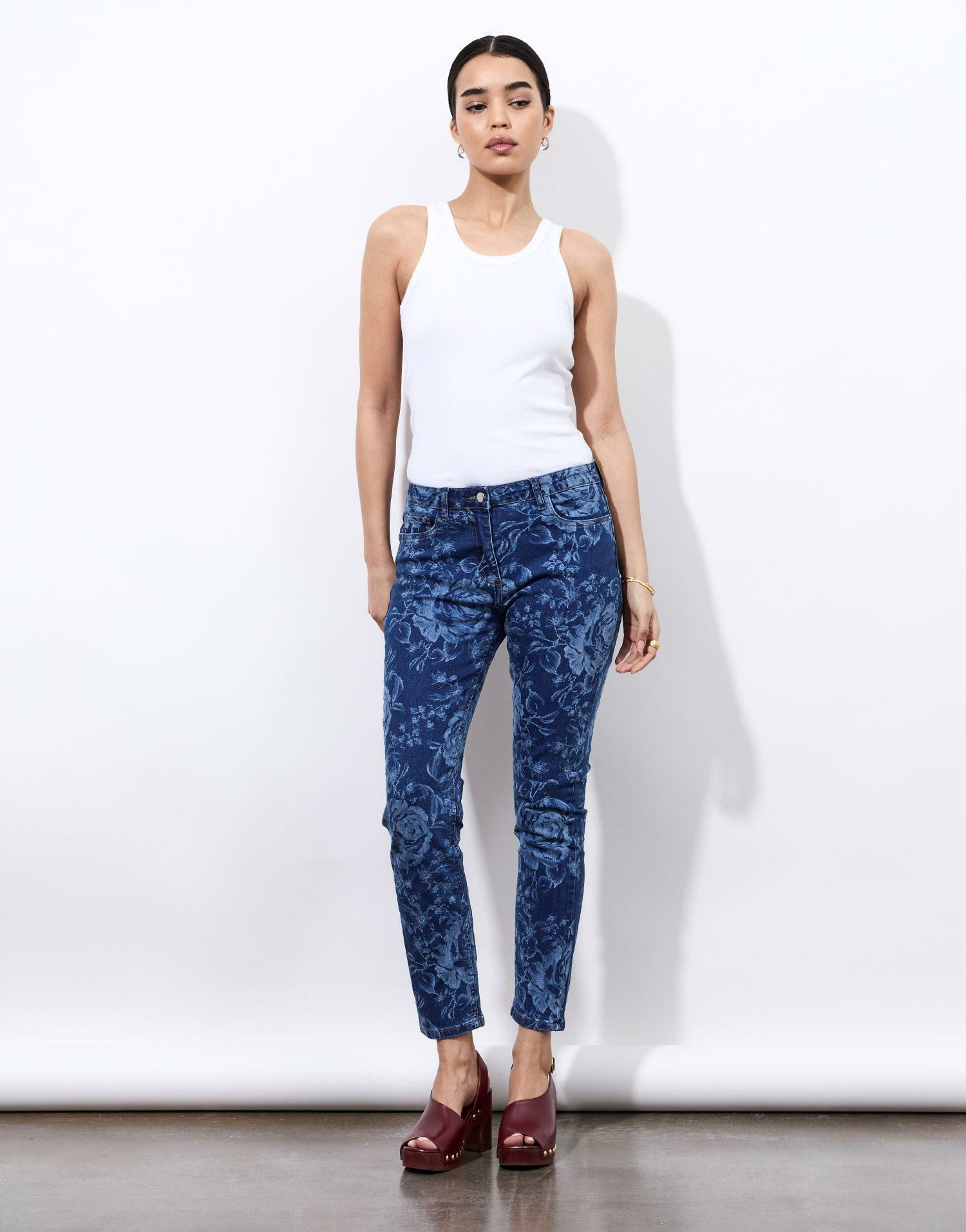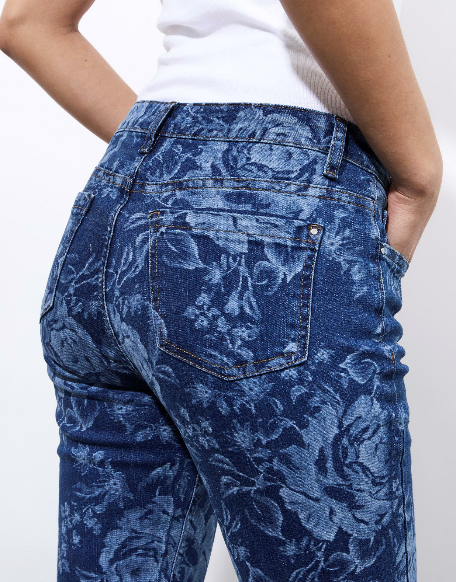 Jean 7/8 en denim bleu à coupe ajustée. Motif floral ton sur ton. Passants pour ceinture, fermeture classique. Poches avant et arrière. La mannequin mesure 1m75 et porte une taille 36.