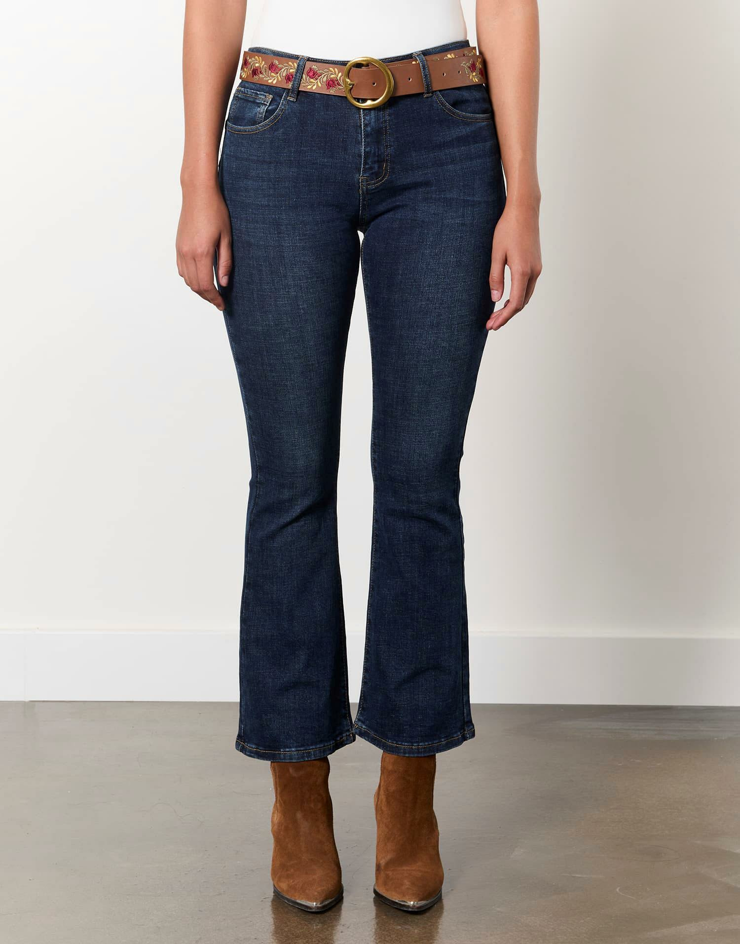 Longueur d’entrejambe : 72 cm. Largeur au niveau du genou : 18 cm. Largeur en bas de jambe : 23 cm. Louna mesure 1m73 et porte une taille 38. Denim brut, coupe bootcut, ceinture brodée de fleurs.