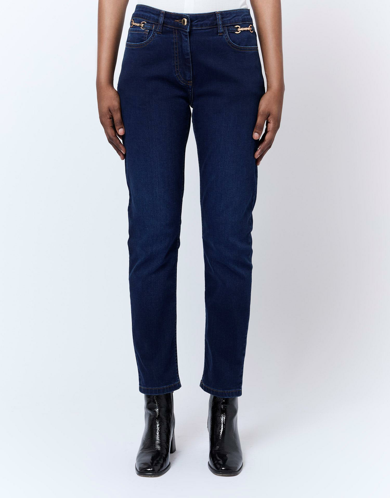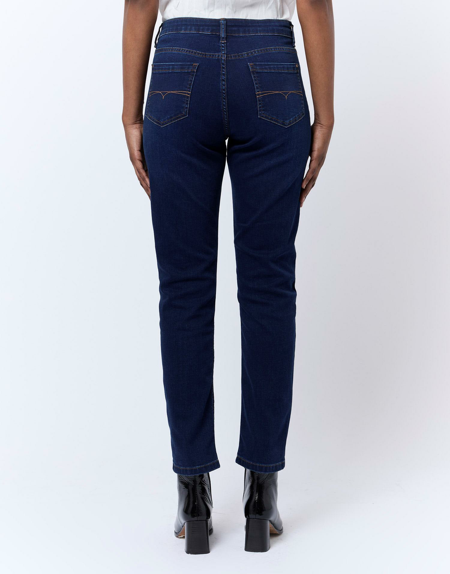 Le jean est fabriqué en denim 100 % coton, avec une coupe 7/8 qui arrive juste au-dessus de la cheville. Il présente une taille mi-haute, cinq poches classiques et une fermeture zippée avec bouton. La finition marine est un indémodable qui s’entretient facilement.