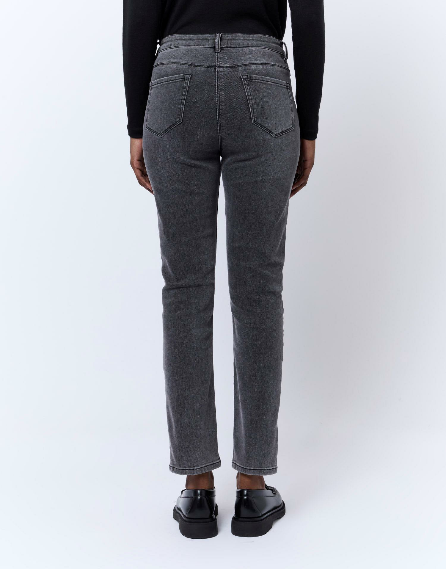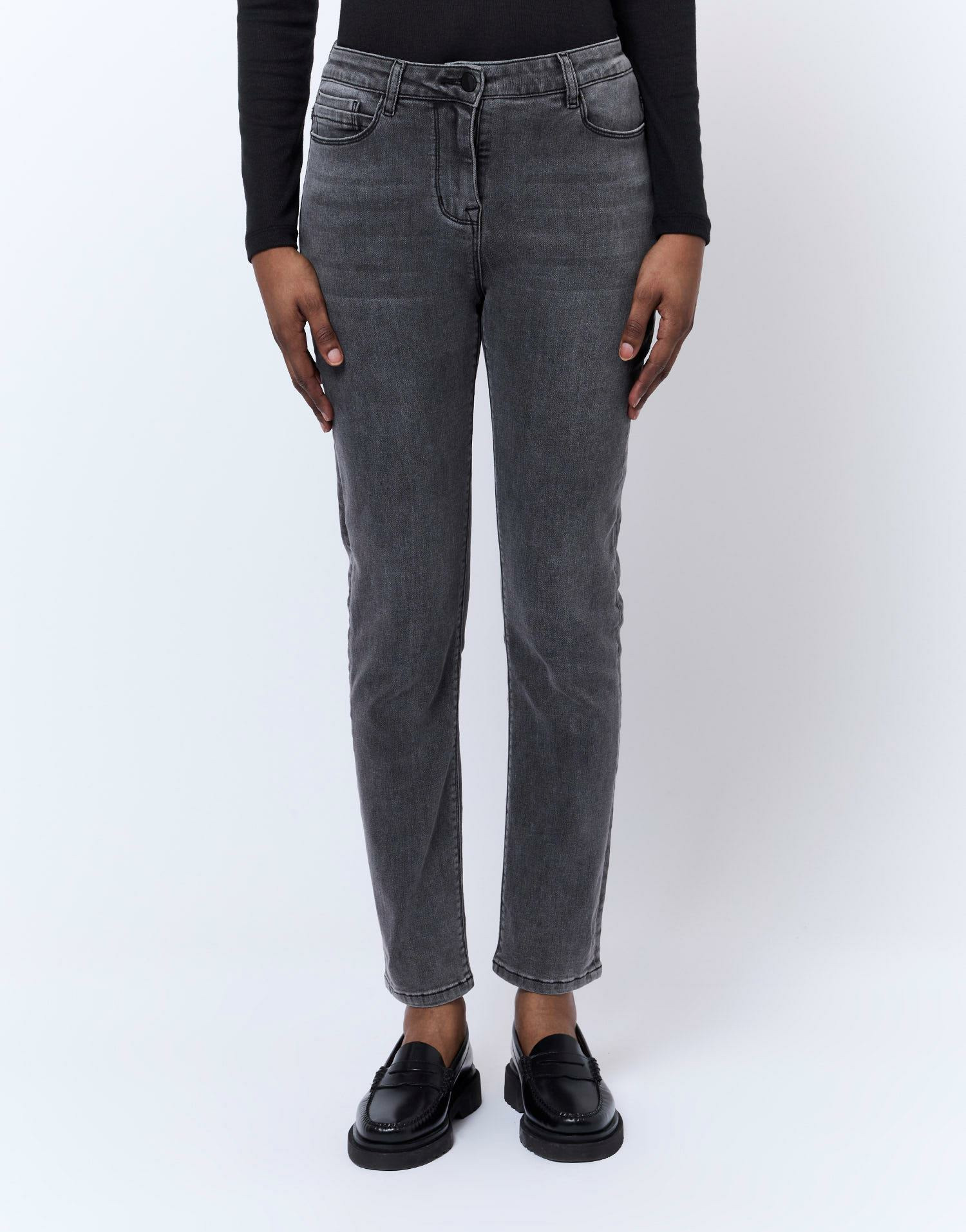 Conçu pour accompagner toutes vos envies, ce jean se distingue par son confort et sa polyvalence. Il s’adapte aussi bien à une tenue casual qu’à un look plus sophistiqué, grâce à sa teinte gris neutre et sa coupe slim qui affine la jambe. Bineta, notre modèle, mesure 1m75 et porte une taille 38, illustrant parfaitement la coupe flatteuse de ce jean.