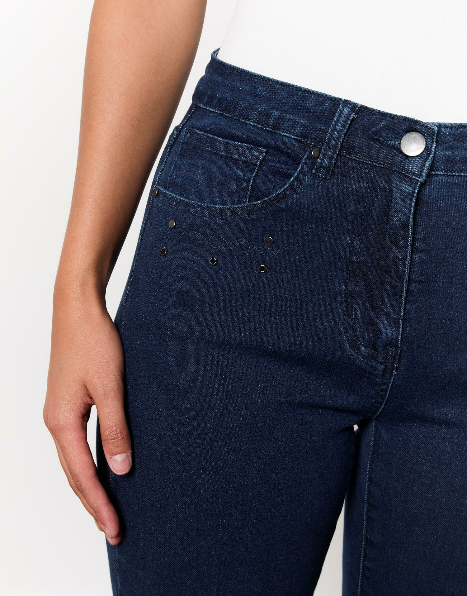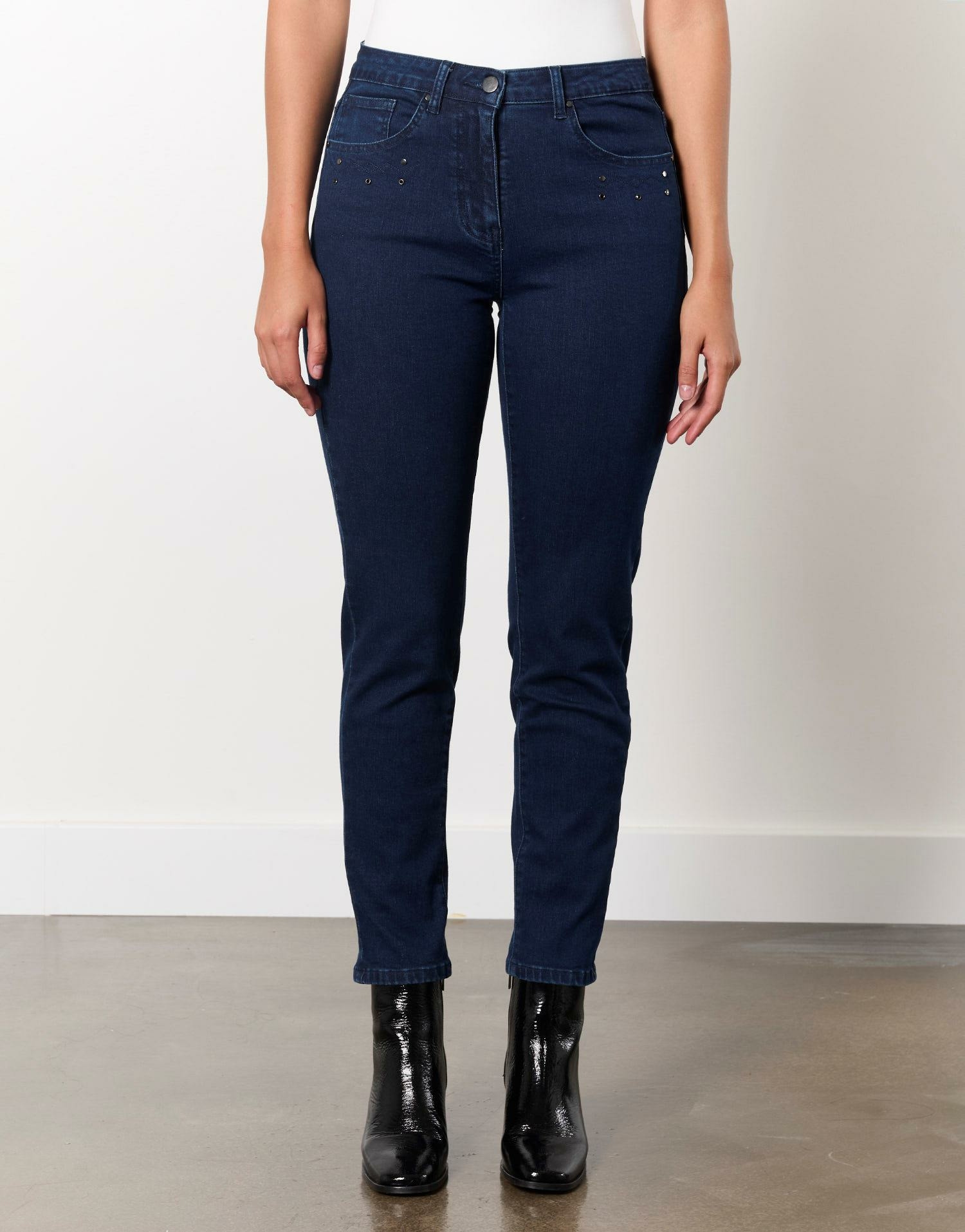 Conçu pour allier style et confort, ce jean épouse parfaitement les formes grâce à sa coupe slim. Les strass noirs brodés sur les poches avant et arrière ajoutent une note sophistiquée et originale, idéale pour rehausser un look casual ou chic. Facile à associer, il devient rapidement un incontournable de votre garde-robe.