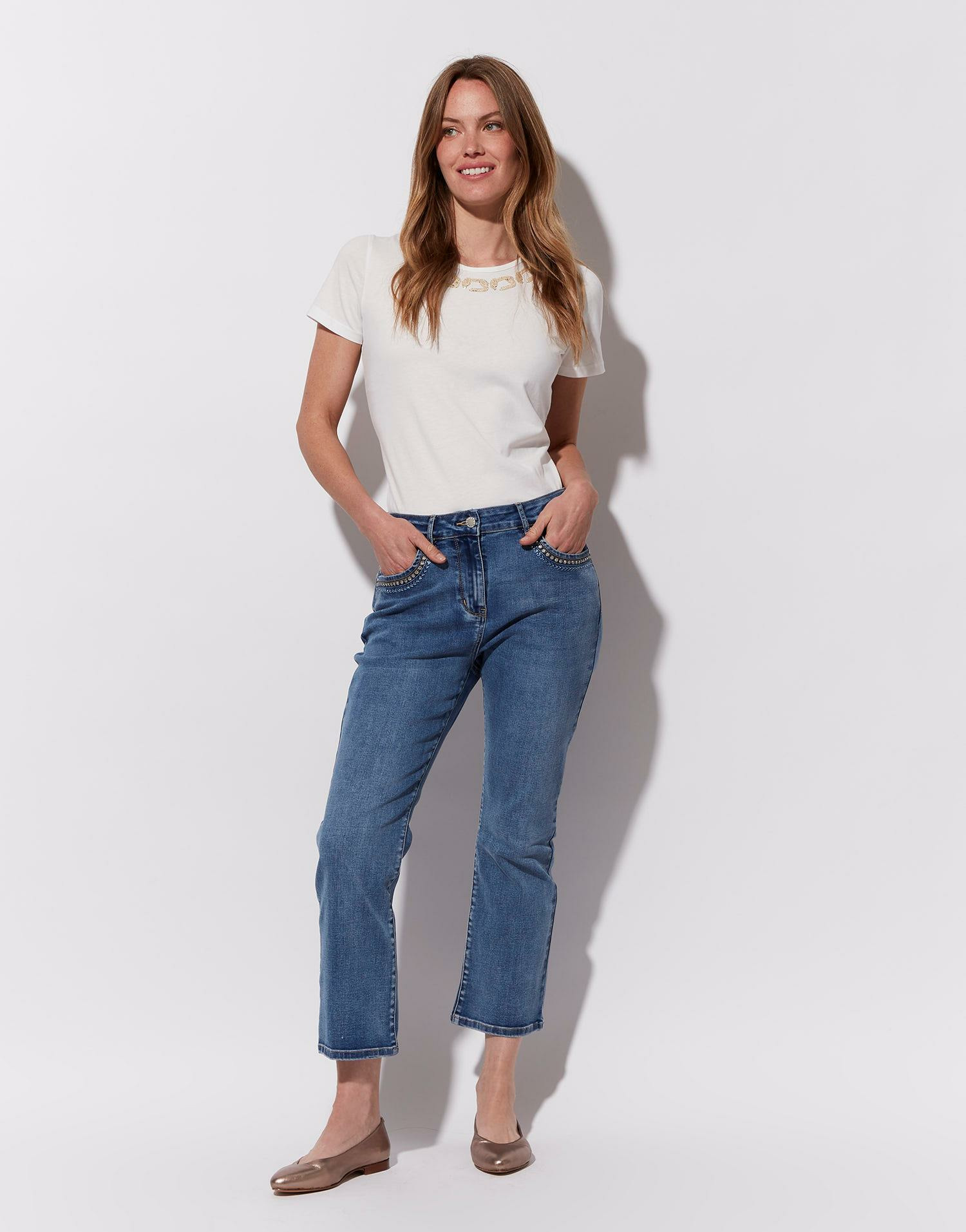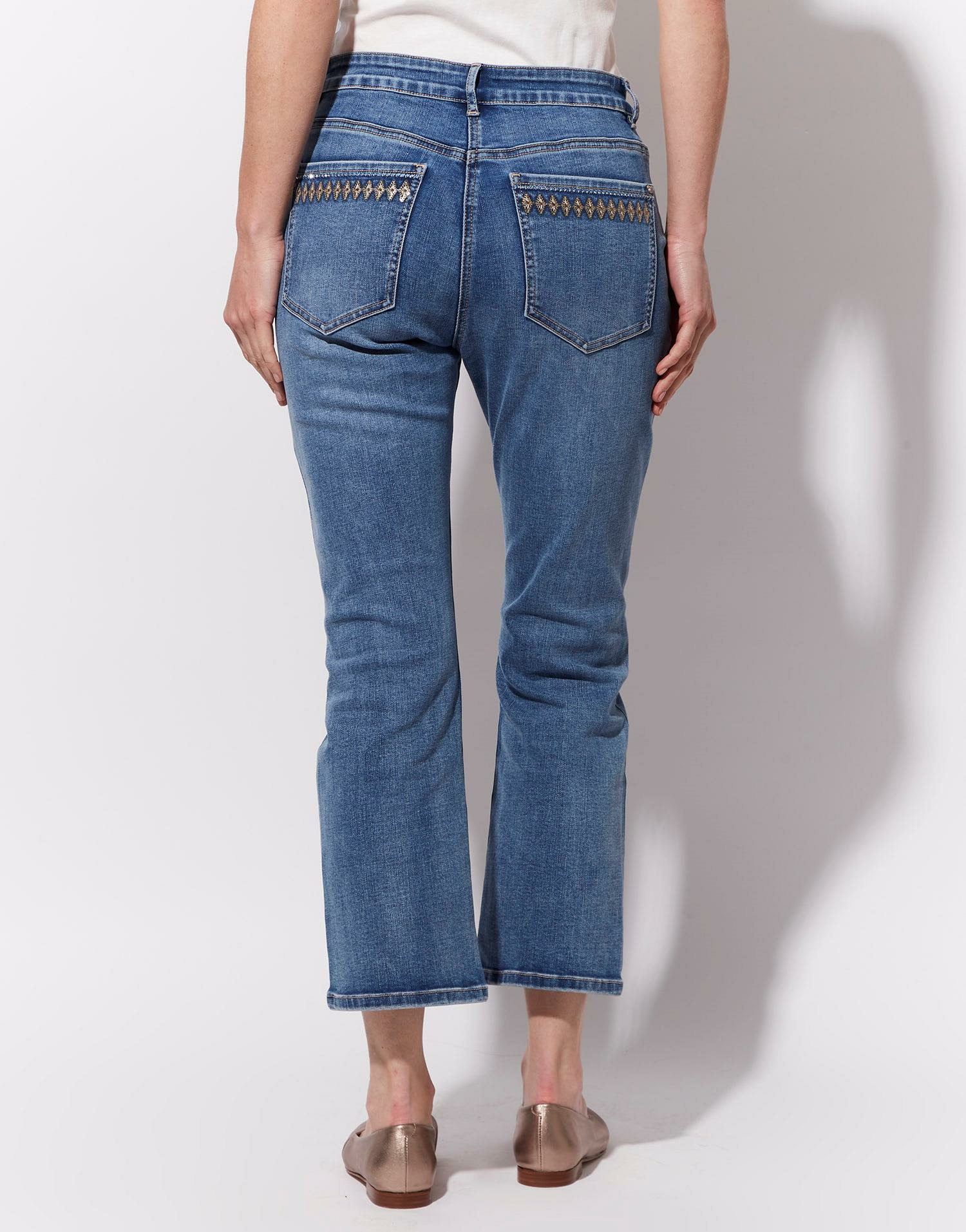 Confectionné dans un denim doux et léger, ce jean cropped se distingue par ses poches ornées de broderies délicates qui apportent une touche d’originalité sans en faire trop. Sa coupe bootcut, légèrement évasée à partir du genou, équilibre parfaitement confort et style, pour un look moderne et facile à associer. Portez-le avec un top fluide ou un pull ajusté, il s’adapte à toutes vos envies.