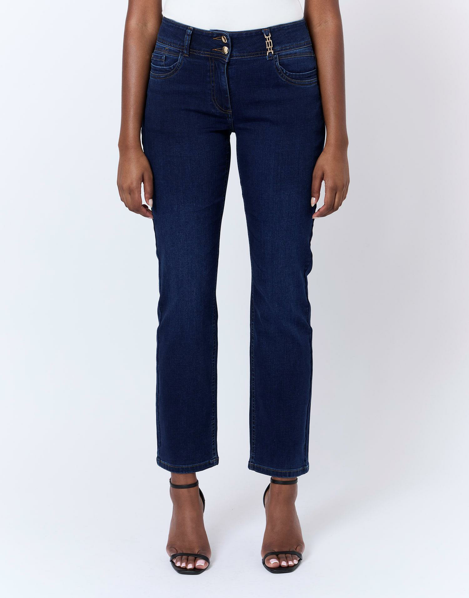 Confectionné dans un denim bleu marine profond, ce jean se distingue par sa coupe droite classique, idéale pour structurer la jambe sans la contraindre. Le détail doré sur un passant apporte une touche de sophistication discrète, tandis que les cinq poches traditionnelles renforcent son côté pratique. Facile à associer, il s’adapte aussi bien à un look casual qu’à une tenue plus habillée, pour un style polyvalent au quotidien.