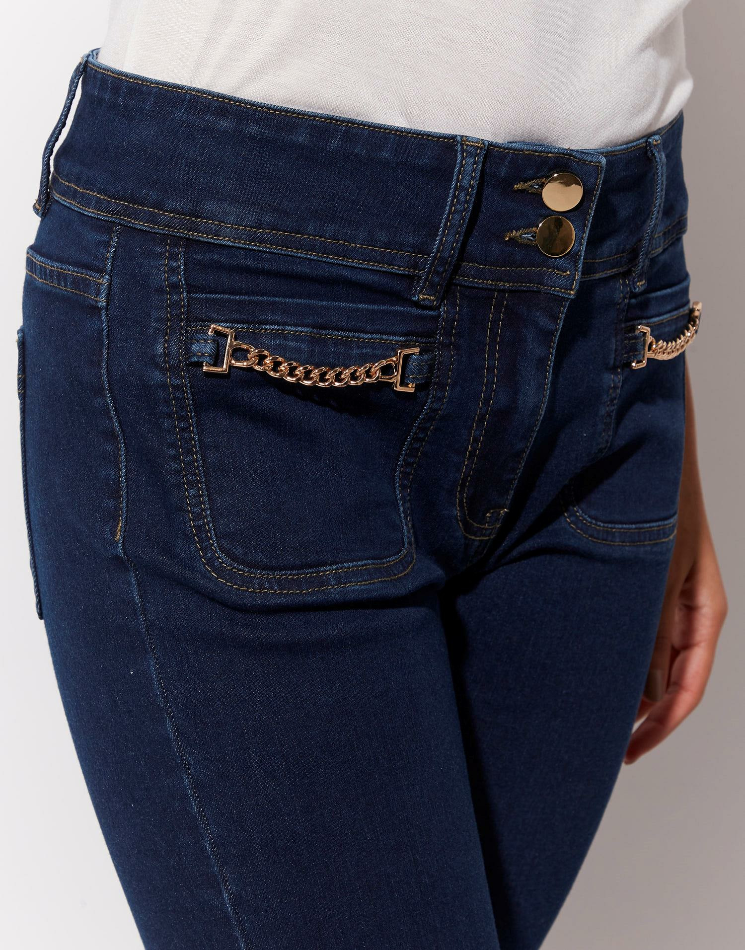 Conçu pour sublimer la silhouette, ce jean à la coupe droite offre un équilibre parfait entre confort et style. La chaîne dorée délicatement posée sur les poches avant apporte une touche sophistiquée et unique, qui fait toute la différence. Bianca, notre modèle, mesure 1m75 et porte une taille 38, illustrant parfaitement la coupe moderne et flatteuse de ce jean.