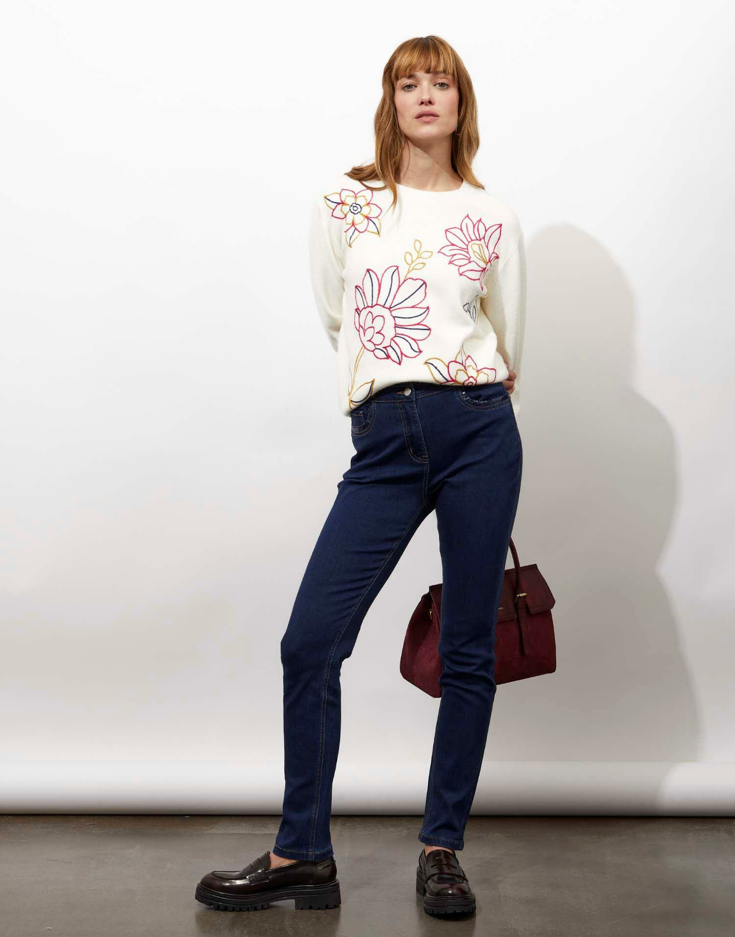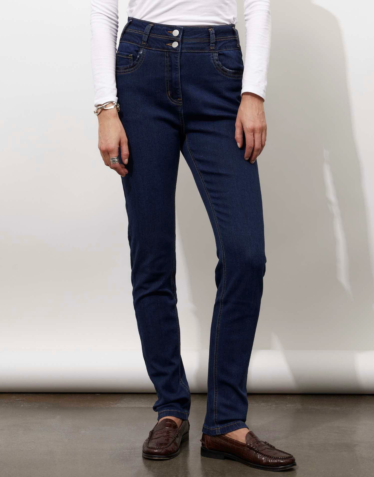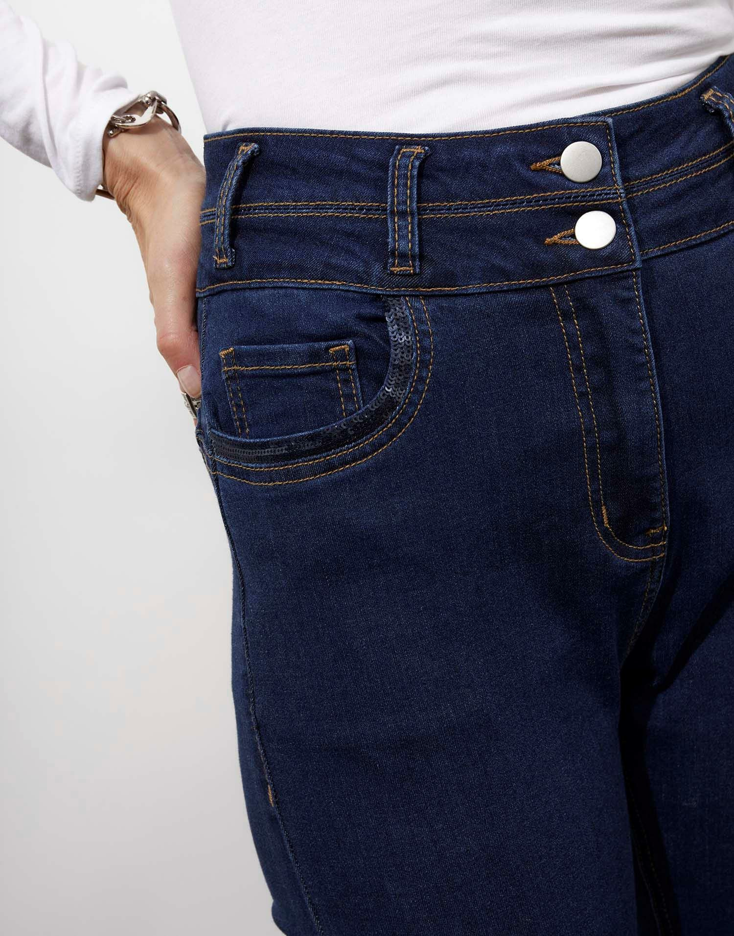 Jean long slim bleu pour femme, coupe ajustée, liseré de sequins sur les poches. La mannequin mesure 1m75 et porte une taille 38.