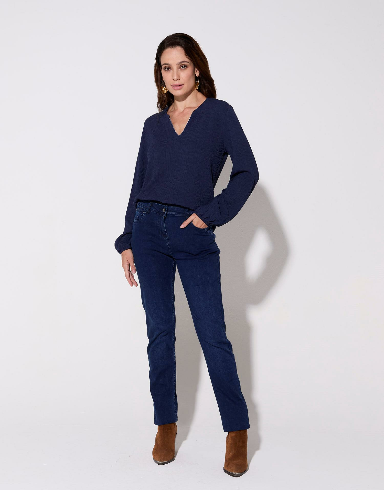 Adoptez une allure élégante et contemporaine avec ce jean long slim MARINE signé RIU Paris. Sa teinte denim foncé et sa coupe ajustée sculptent votre silhouette avec finesse.