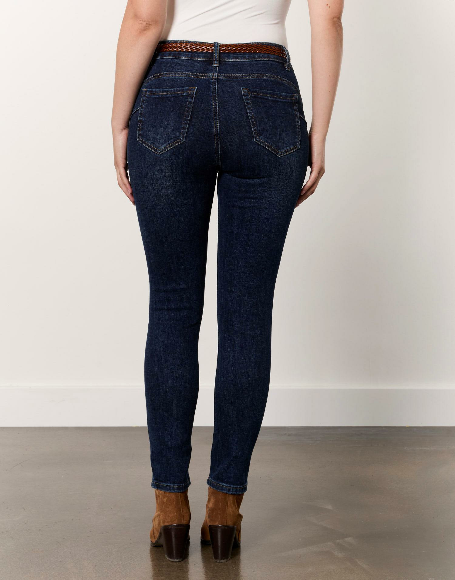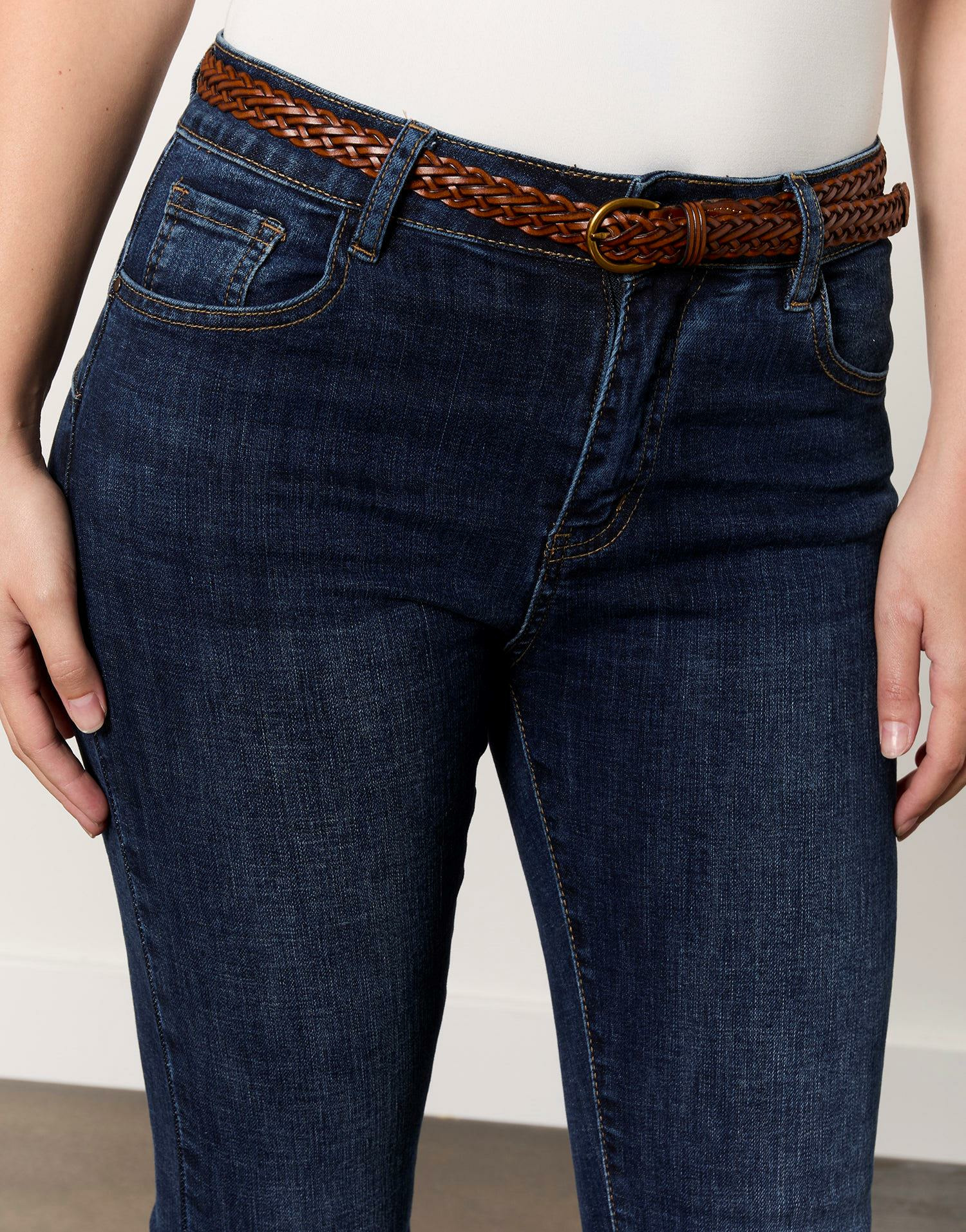 Ce jean allie style et praticité : la coupe slim affine la silhouette, la ceinture tressée assure un maintien parfait sans sacrifier le confort, et la couleur denim brut reste intemporelle pour un usage au quotidien.
