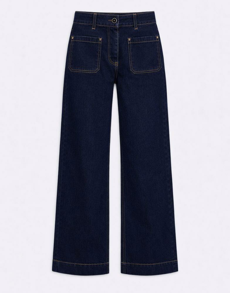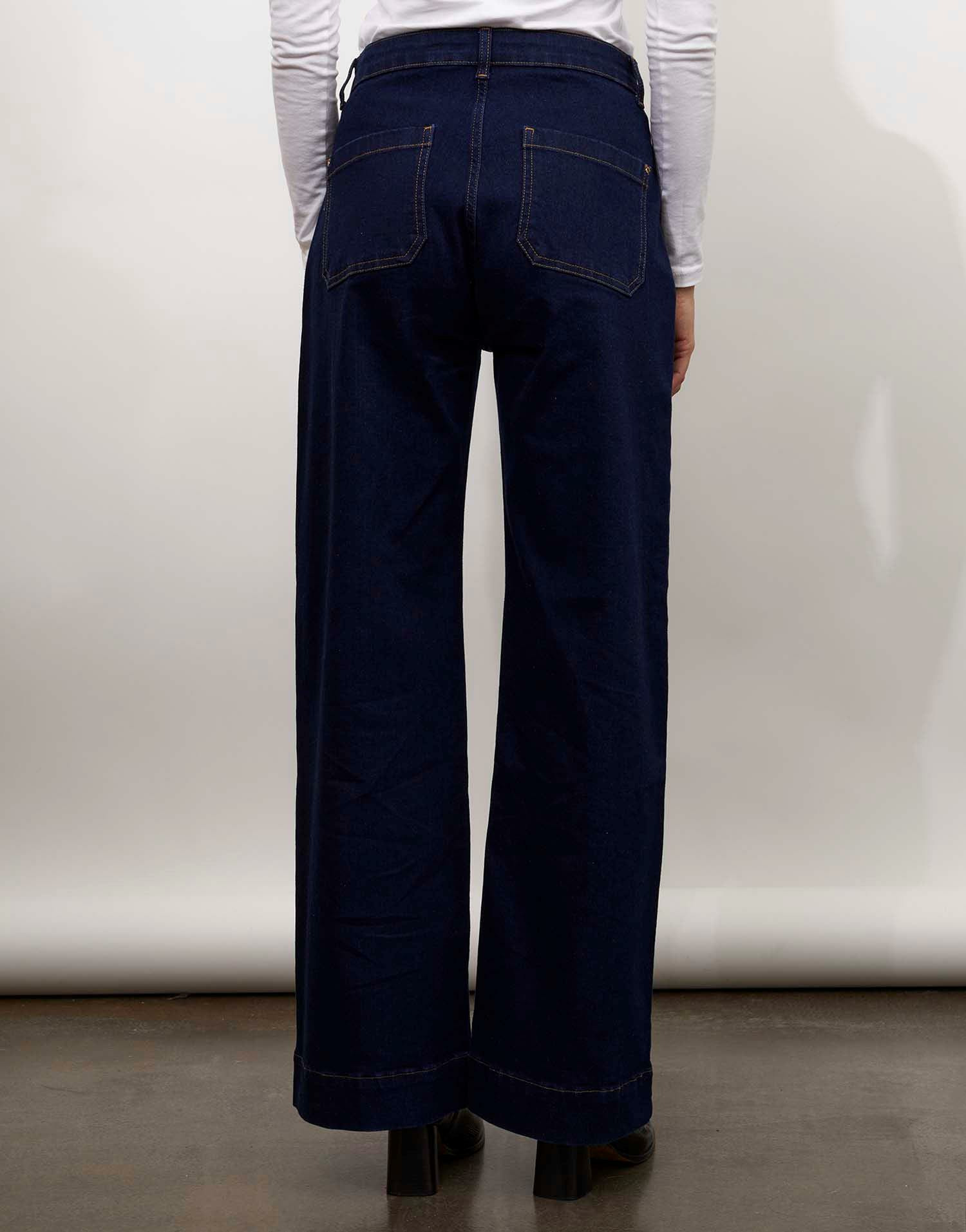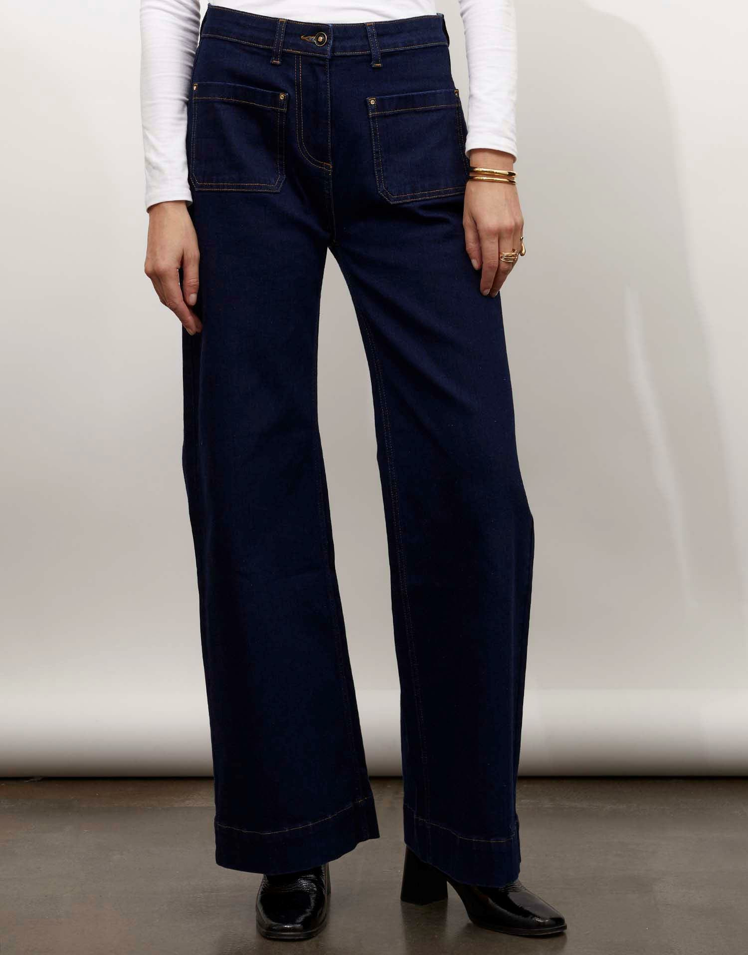 Jean long à la coupe wide, quatre poches plaquées, couleur Marine. La mannequin mesure 1m75 et porte une taille 38.
