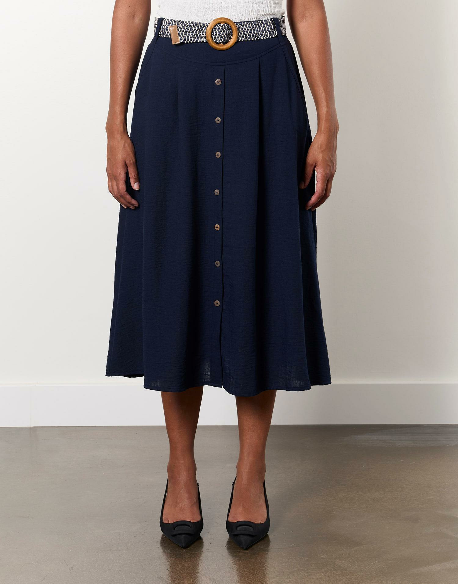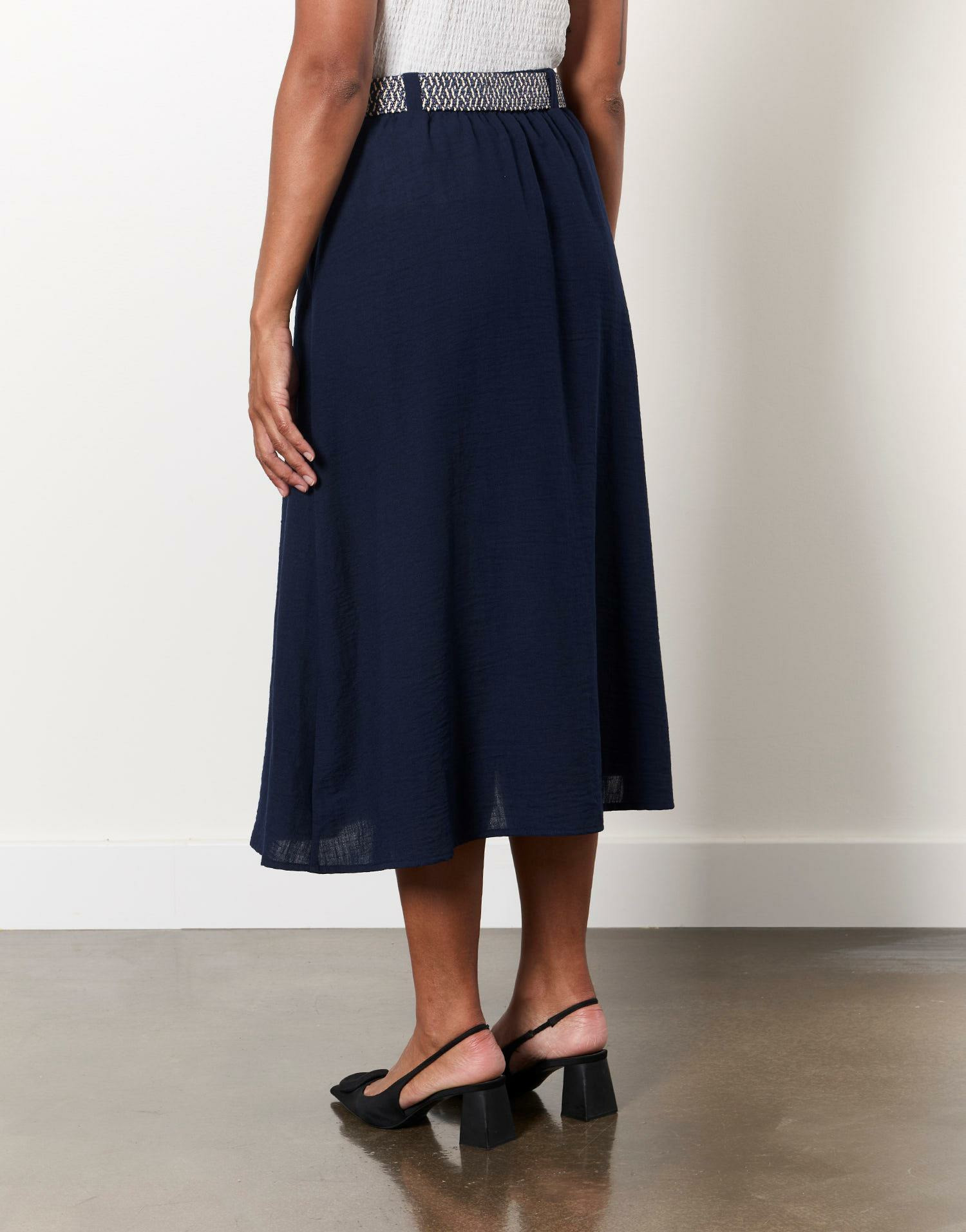Conçue dans un tissu fluide, cette jupe épouse délicatement les courbes tout en offrant un confort optimal. Sa coupe légère crée un mouvement naturel et gracieux à chaque pas, tandis que la ceinture assortie souligne la taille avec finesse. Facile à porter, elle se marie aussi bien avec un haut blanc pour un look estival que sous un pull pour affronter les journées plus fraîches.