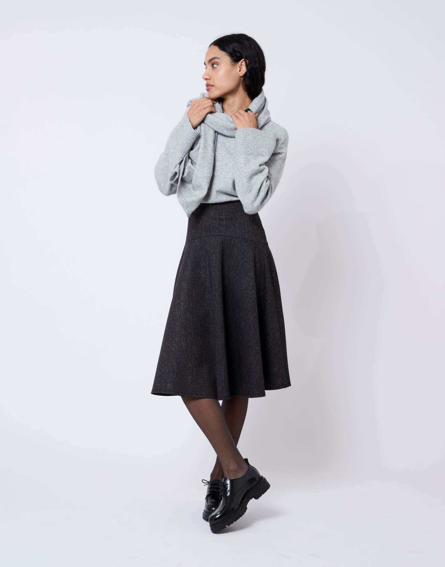 Réponse : Oui, cette jupe midi s’accorde aussi bien avec des chaussures plates qu’avec des talons pour varier les styles.