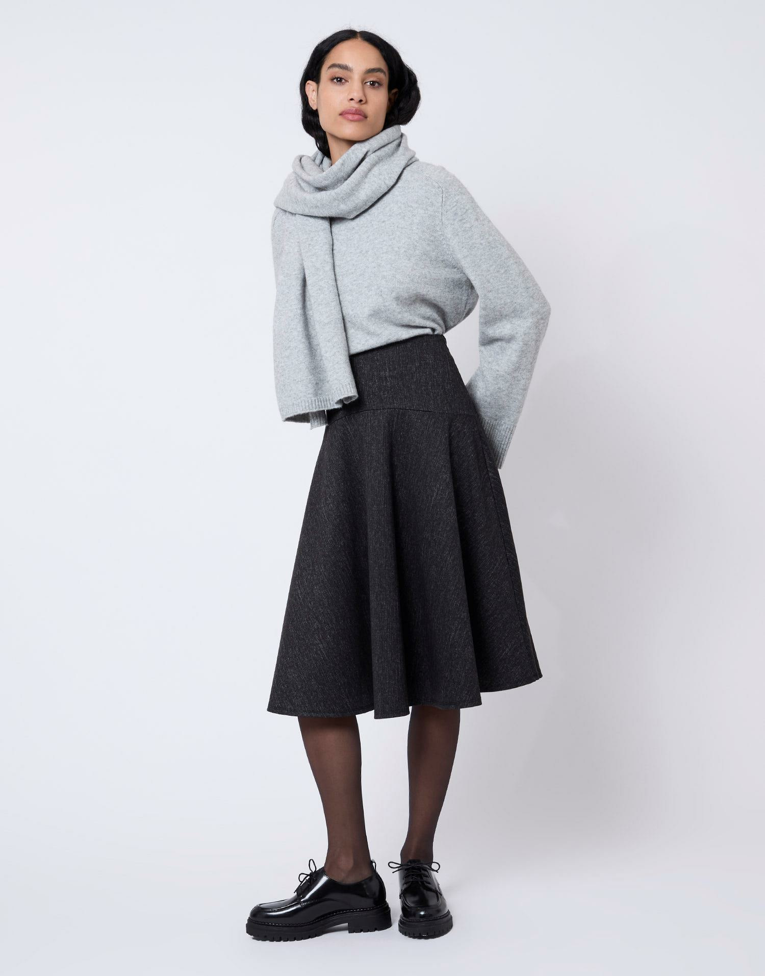 Cette jupe midi évasée dessine une silhouette harmonieuse grâce à sa coupe fluide et ses empiècements fantaisie placés subtilement au niveau des hanches. Le jeu de textures apporte une touche féminine et moderne, tandis que le zip discret garantit une finition impeccable. Facile à associer, elle s’adapte aussi bien à un look casual qu’à une tenue plus sophistiquée.