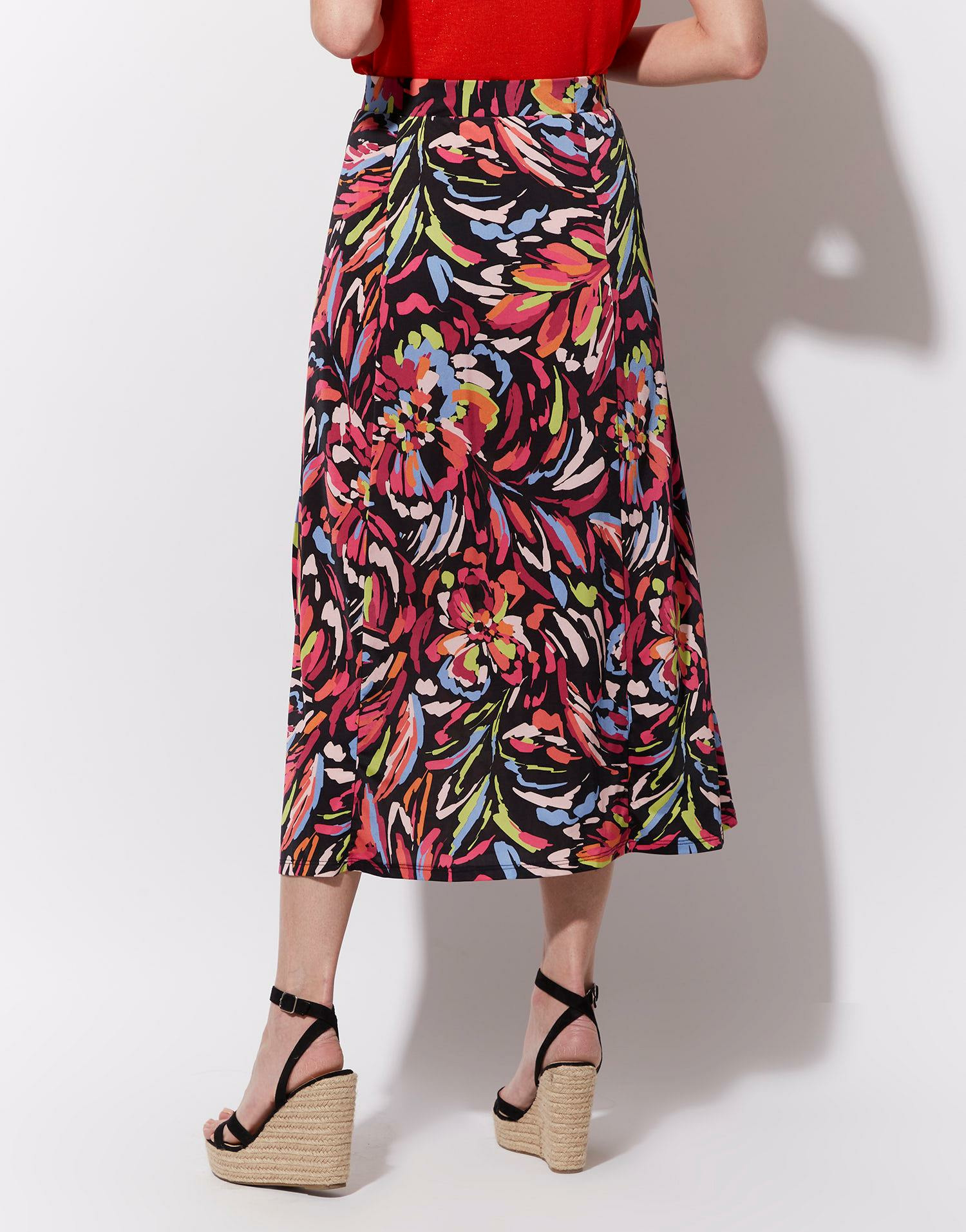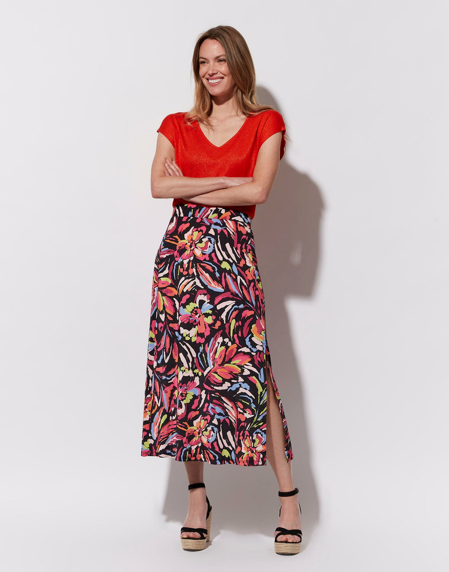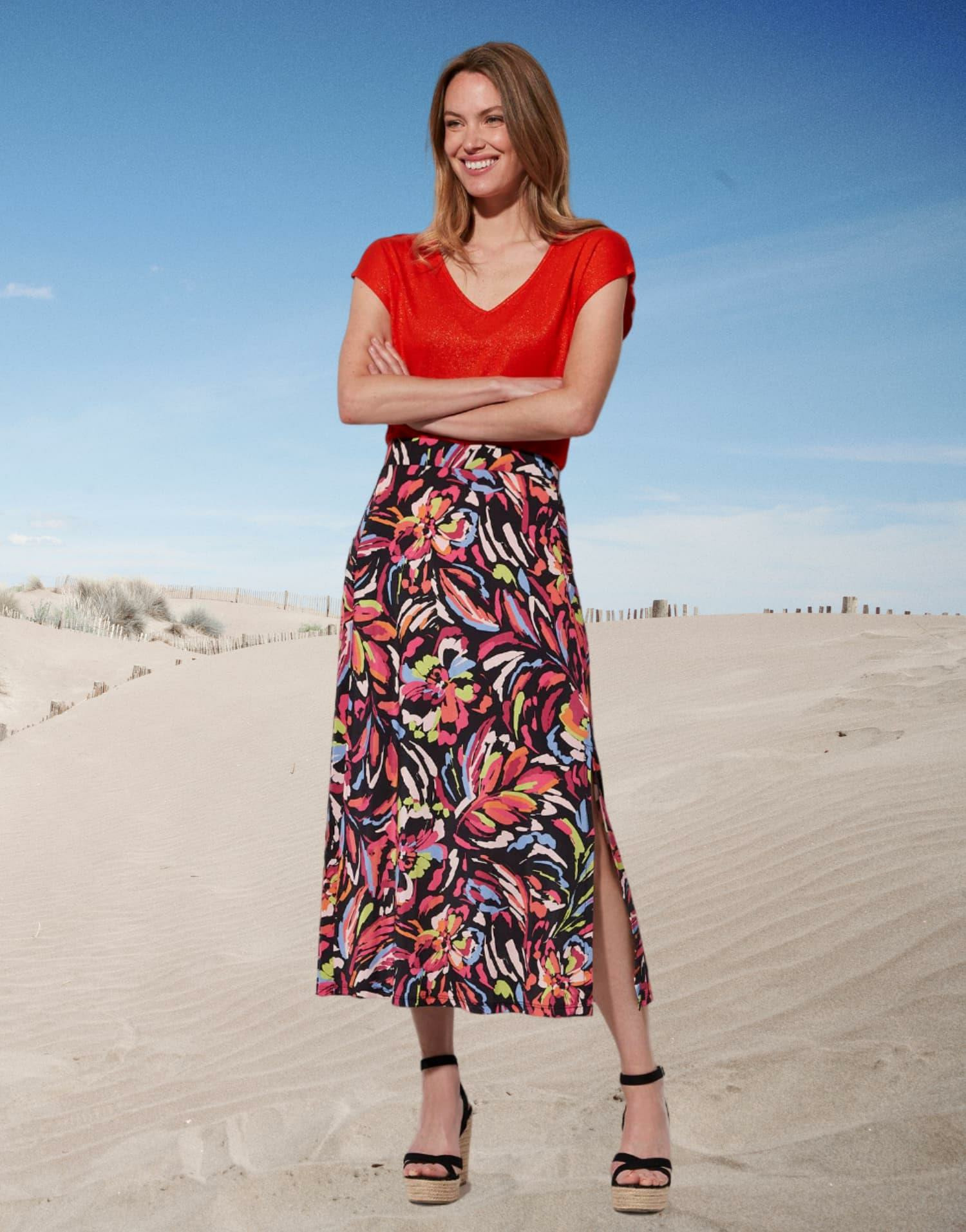 Taille élastiquée pour un ajustement parfait, longueur midi avec fente latérale, imprimé exclusif RIU Paris. Emily mesure 1m79 et porte une taille 38.