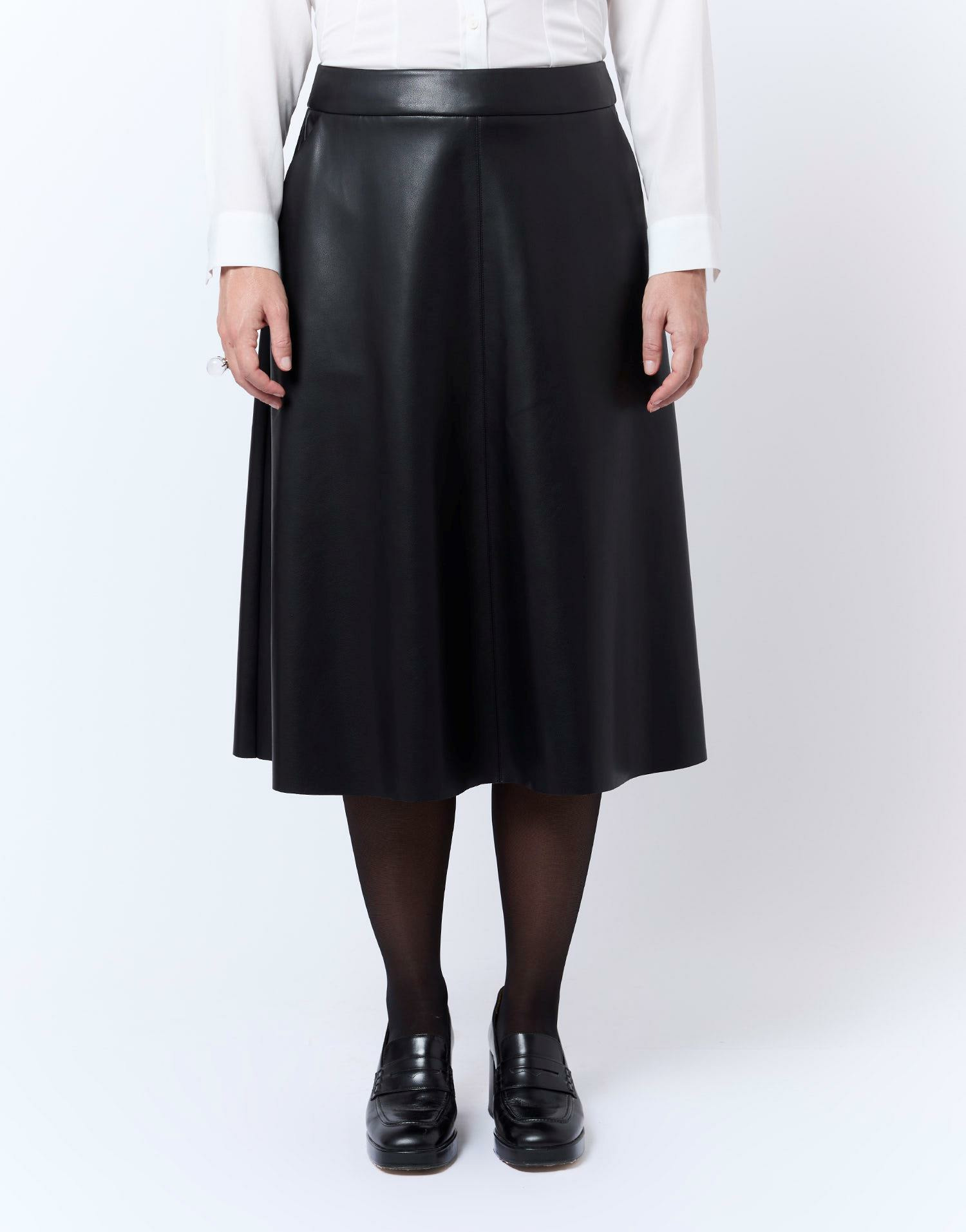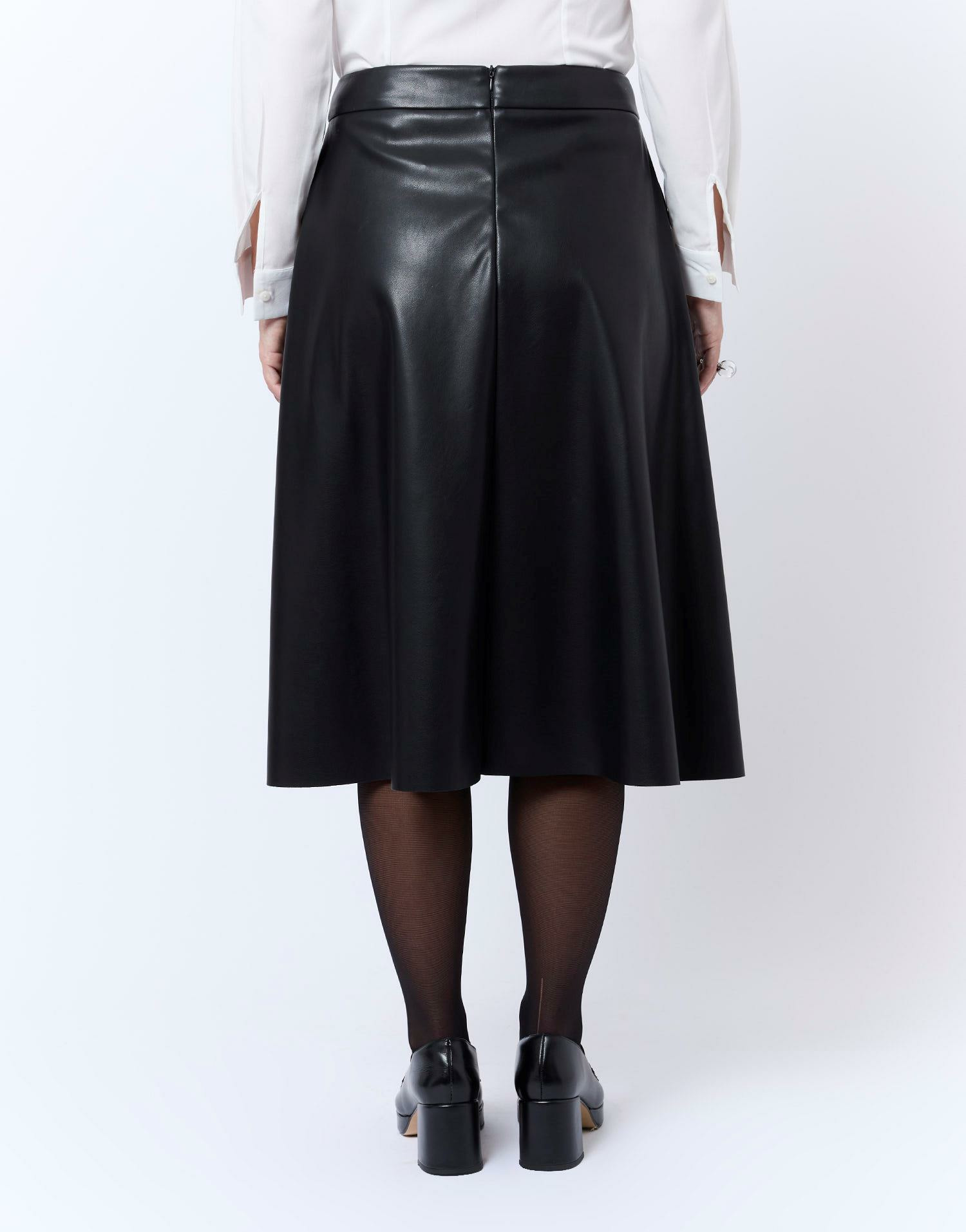 Matière : simili cuir noir. Coupe midi droite. Taille portée par le modèle : 38. Longueur midi adaptée à toutes les morphologies. Entretien facile, nettoyage à sec recommandé.