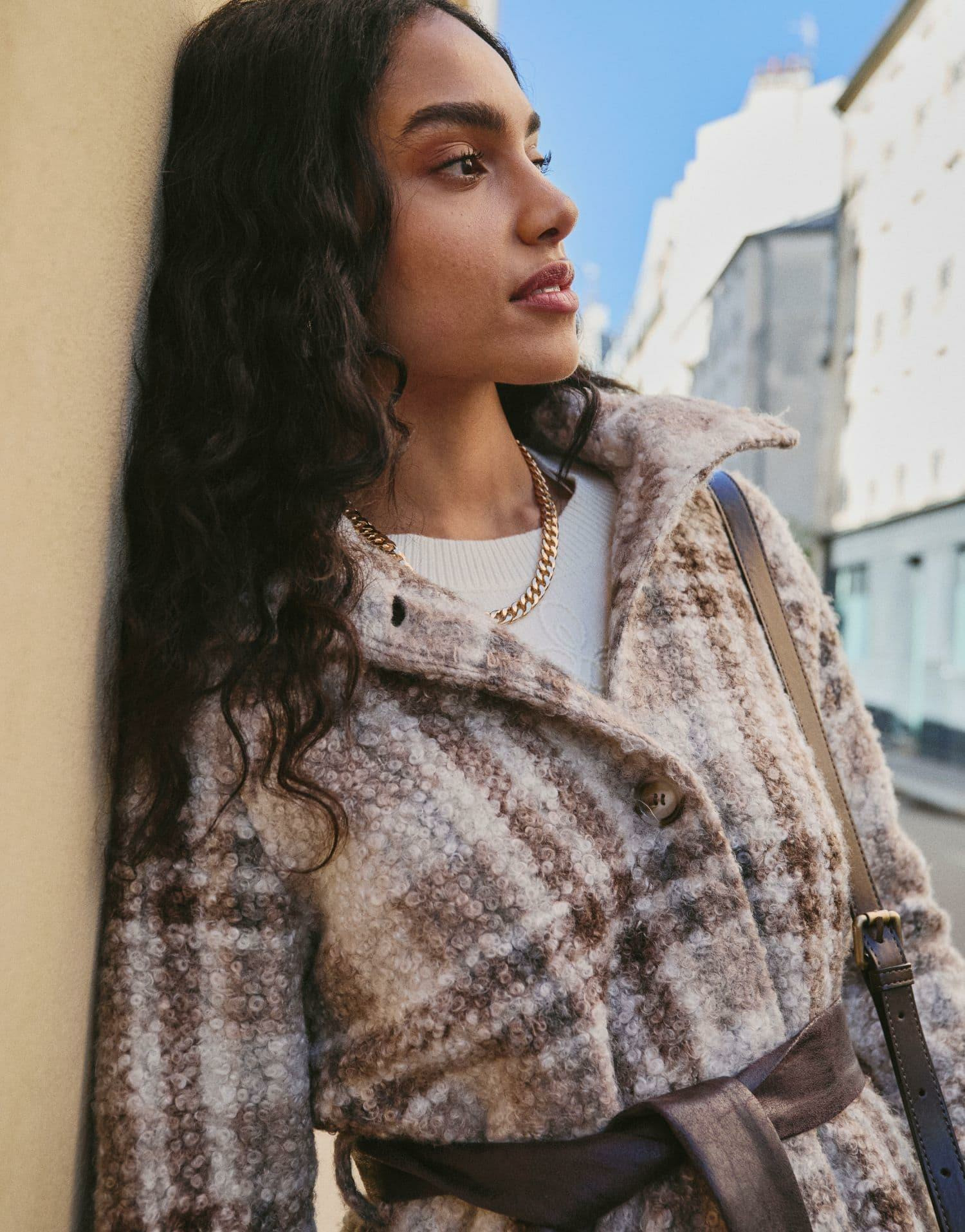 Confectionné en bouclettes douces, ce manteau allie confort et style avec ses manches longues et sa capuche amovible, idéale pour s’adapter à toutes les occasions. La ceinture à la taille souligne votre silhouette avec finesse, apportant une touche d’élégance moderne à vos tenues quotidiennes. Shahed mesure 1m75 et porte une taille 38, pour vous guider dans votre choix.