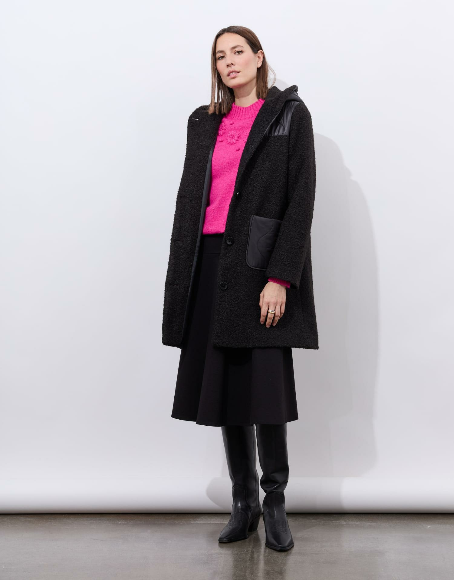 Alliez élégance et chaleur avec ce manteau bi-matière noir signé RIU Paris. Une pièce moderne qui s’impose comme un incontournable de votre garde-robe hivernale.