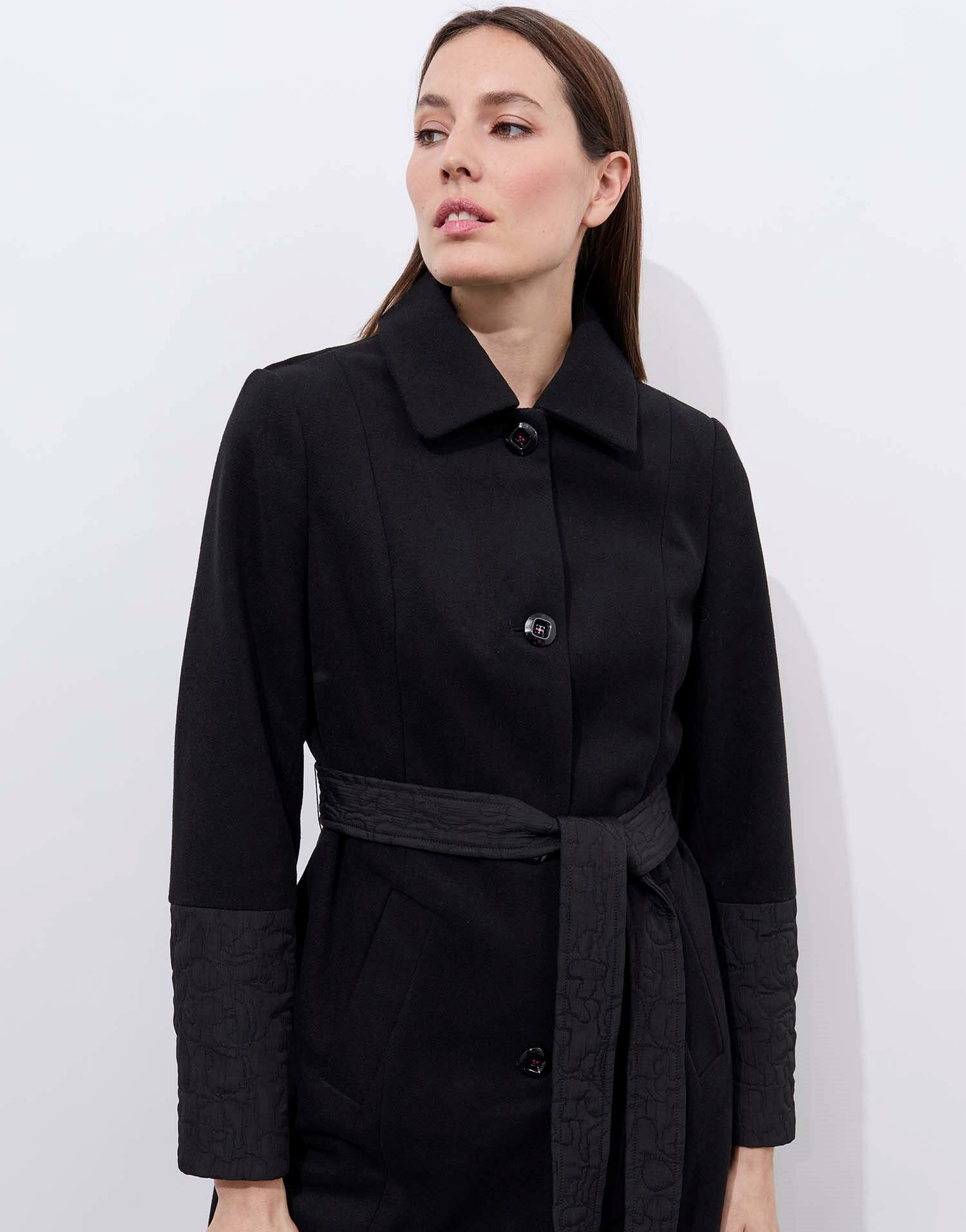 Alliez élégance et modernité avec ce manteau bi-matière noir signé RIU Paris. Sa coupe droite et sa ceinture soulignent la silhouette avec une simplicité raffinée.