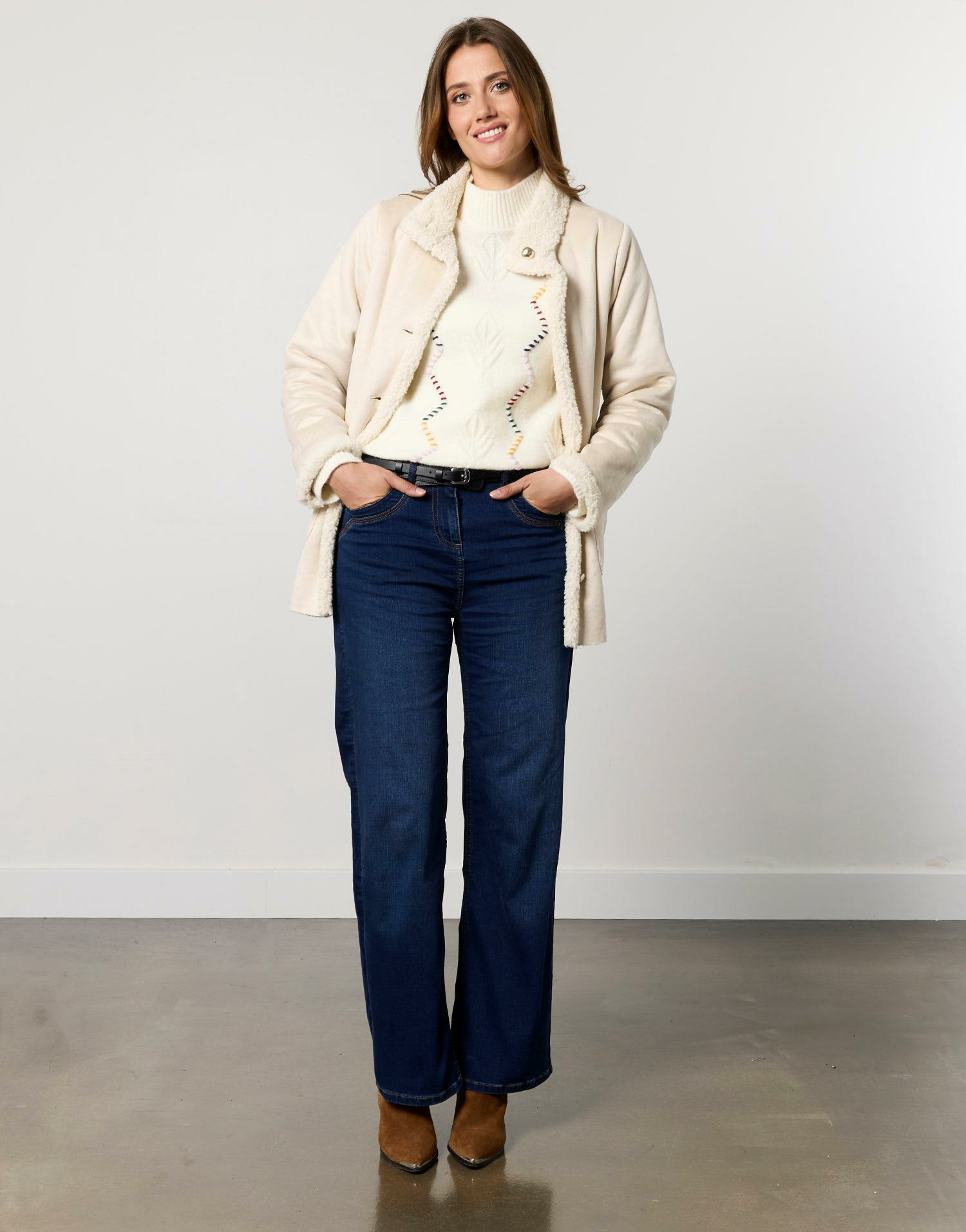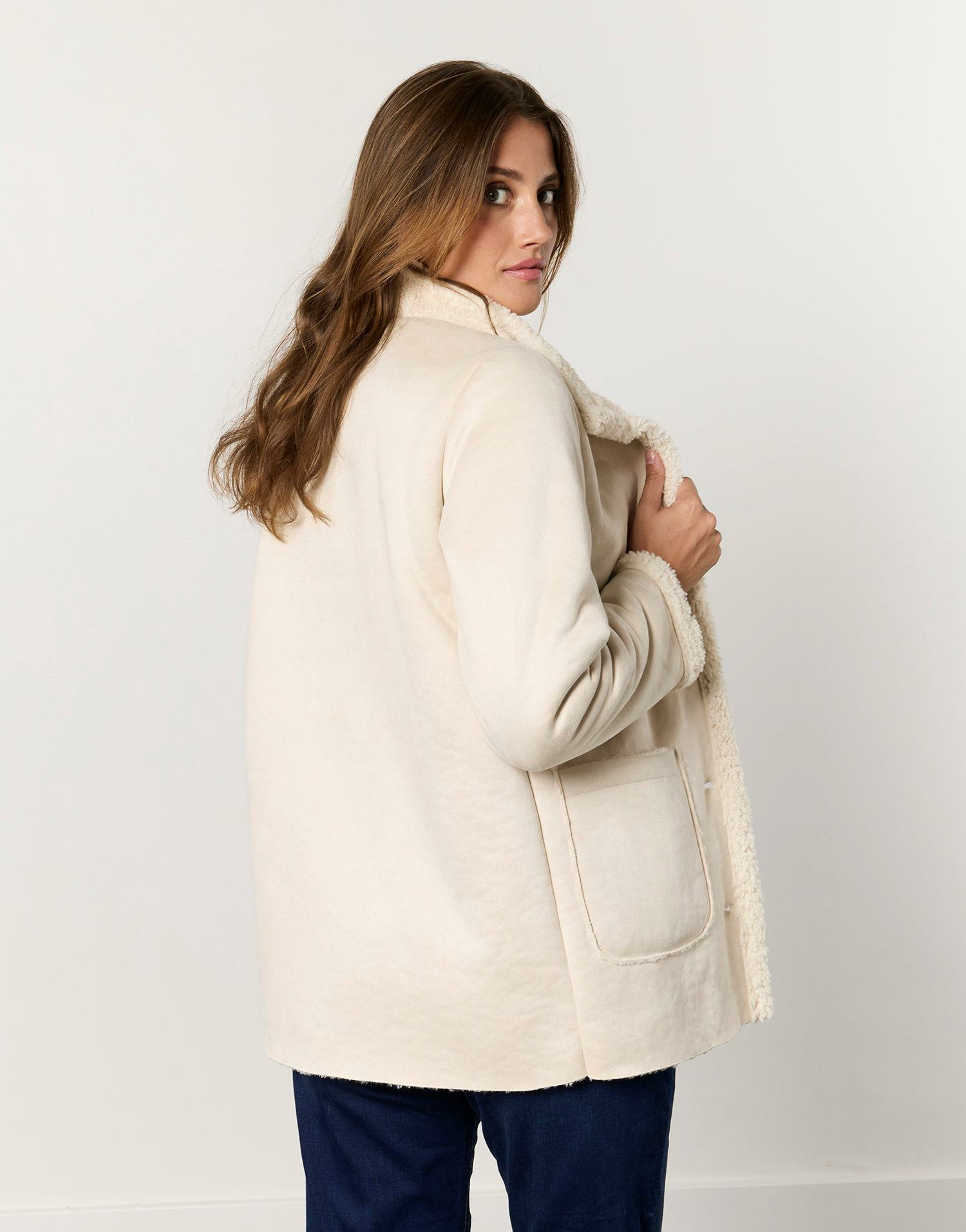 Manteau court uni écru pour femme, fermeture boutonnée avec boutons dorés, coupe droite. Armelle mesure 1m79 et porte une taille 38. Disponible en plusieurs tailles pour un ajustement parfait.