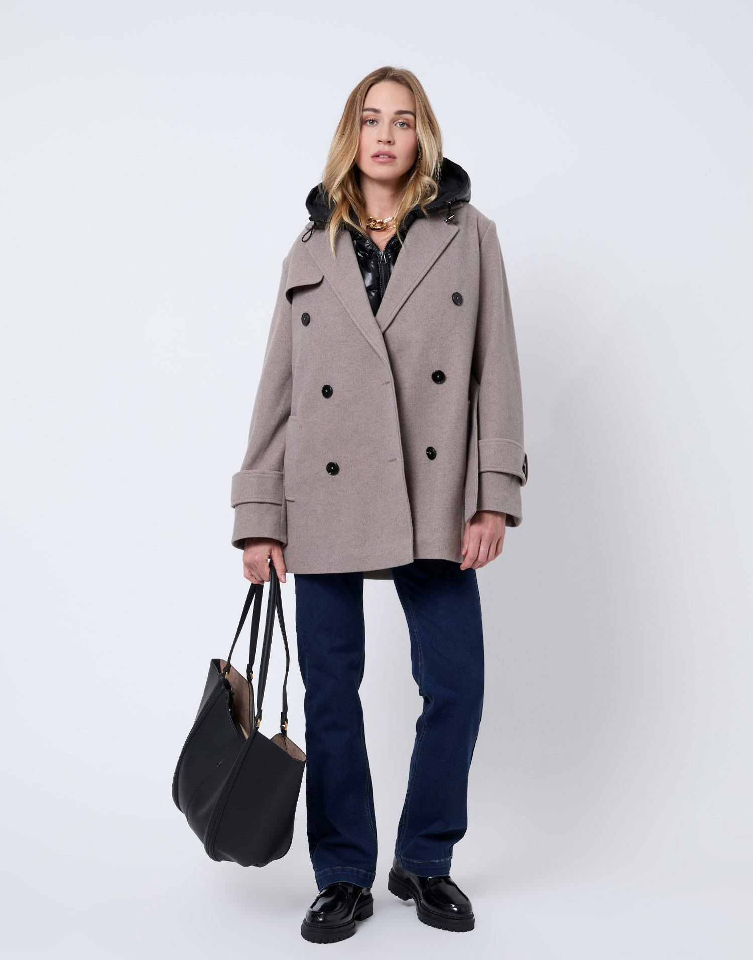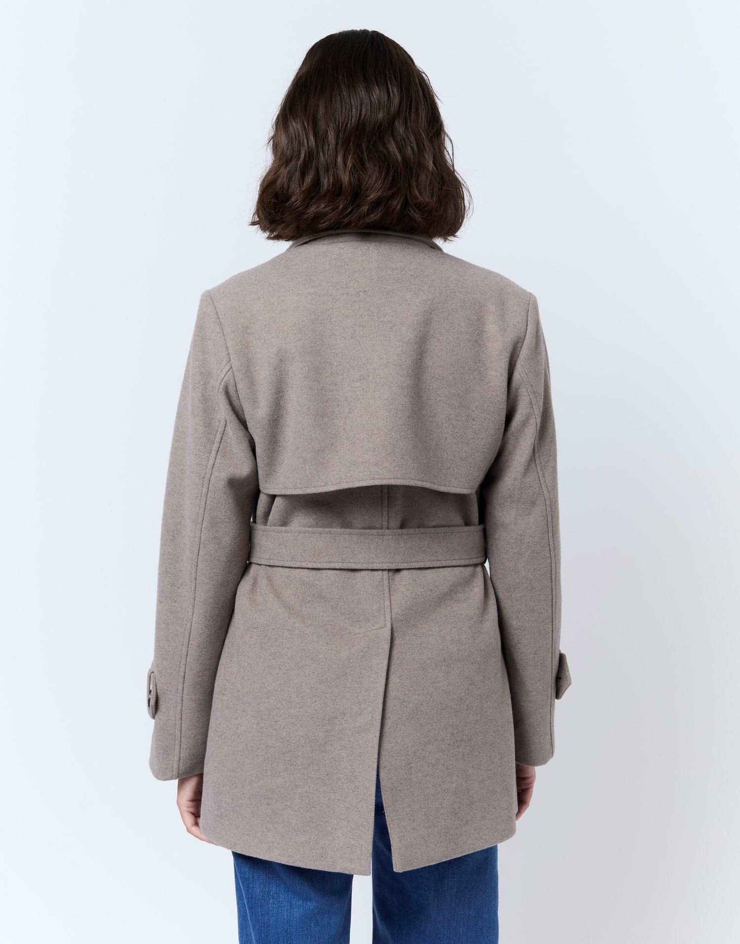 Manteau court uni taupe, double boutonnage, ceinture à boucle pour ajuster la taille, coupe structurée. Manon mesure 1m75 et porte une taille 38. Parfait pour la mi-saison.