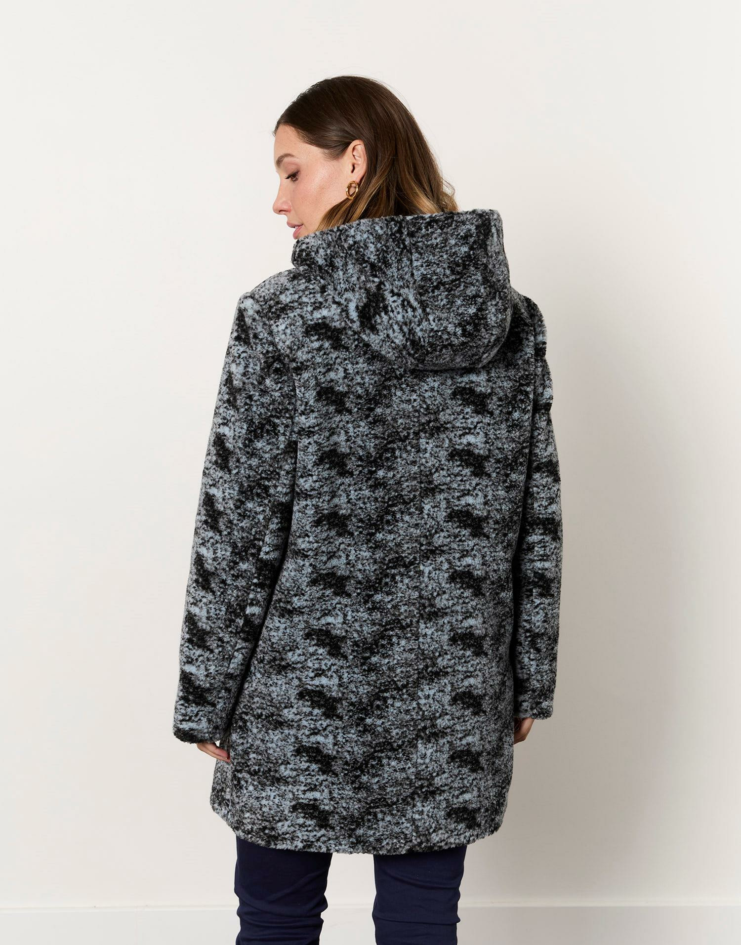 Manteau long imprimé gris pour femme, marque RIU Paris. Matière douce au toucher. Double fermeture zippée et à boucle. Capuche intégrée. Taille portée par le modèle : 38. Hauteur du modèle : 1m78.