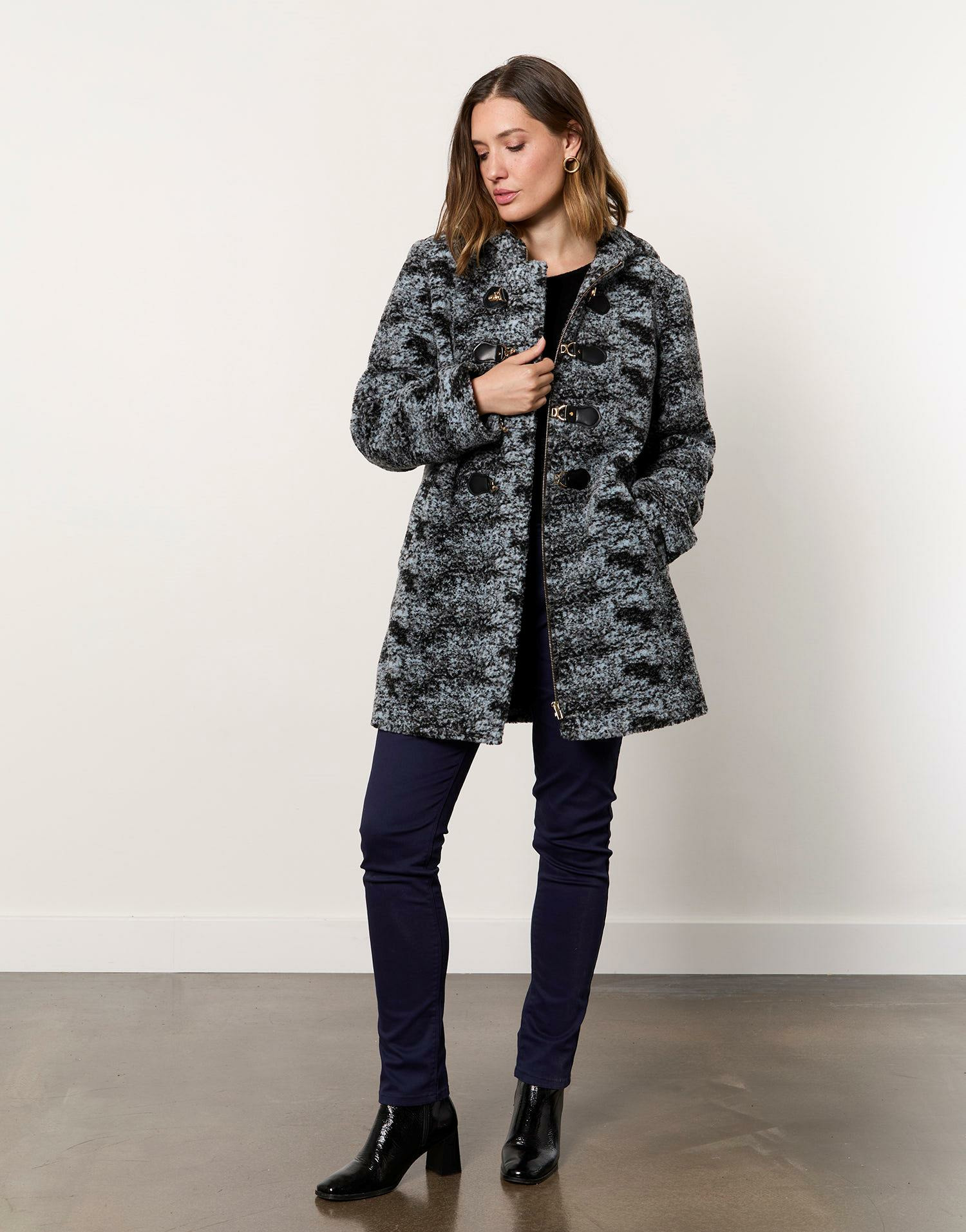 Confectionné dans une matière douce et confortable, ce manteau se distingue par son imprimé unique qui dynamise vos tenues hivernales. La double fermeture zippée et à boucle assure un maintien optimal et un look soigné, parfait pour les journées fraîches en ville ou les balades en plein air. Julie, mesurant 1m78, porte une taille 38, illustrant la coupe ajustée et flatteuse du modèle.