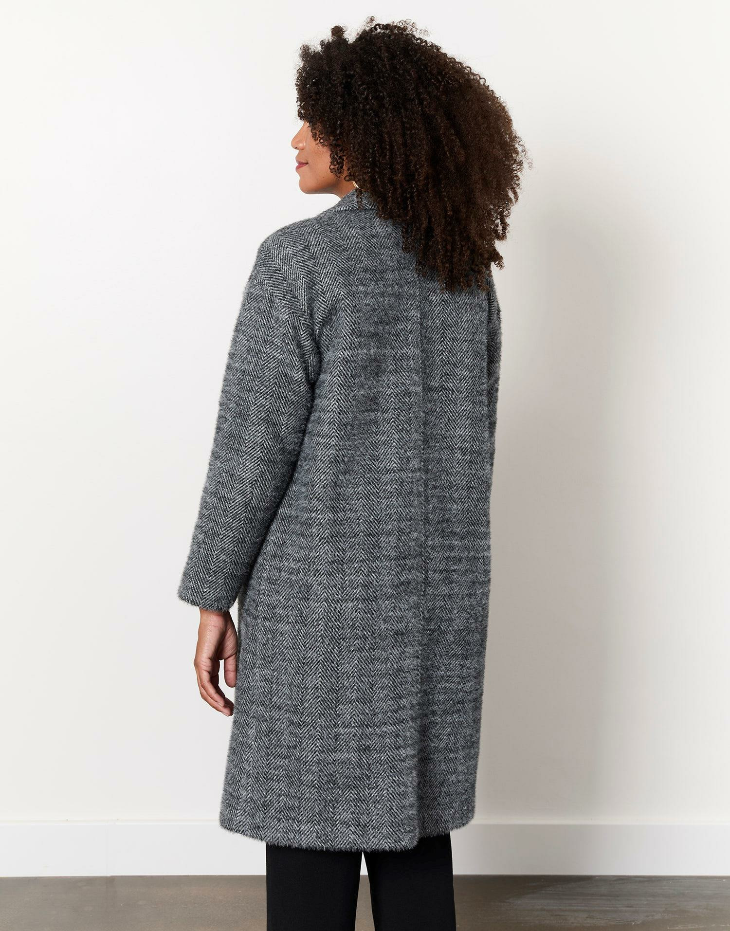 Manteau long uni anthracite pour femme, coupe droite classique, fermeture boutonnée, poches latérales discrètes. Sophie mesure 1m77 et porte une taille 38, garantissant un rendu élégant et ajusté.