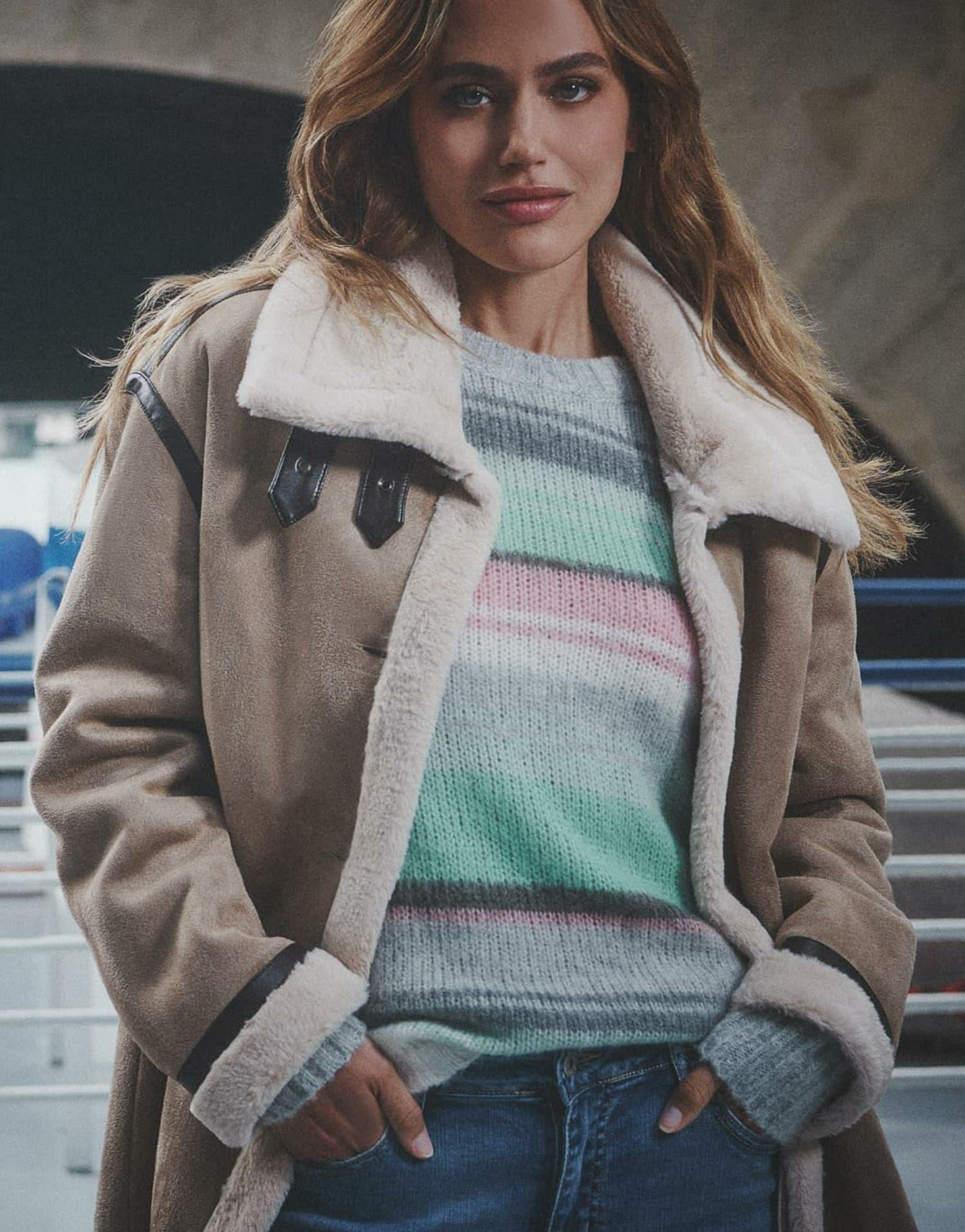 Confectionné en laine, ce manteau se distingue par son col en fausse fourrure, apportant une touche de sophistication et de douceur. Sa coupe longue enveloppe parfaitement la silhouette, offrant une allure élancée et moderne, idéale pour les journées hivernales. Léo, mesurant 1m77, porte une taille 38, illustrant la coupe ajustée et confortable de ce modèle.
