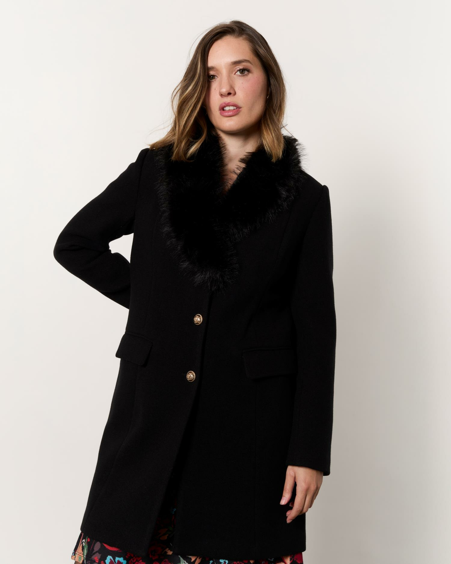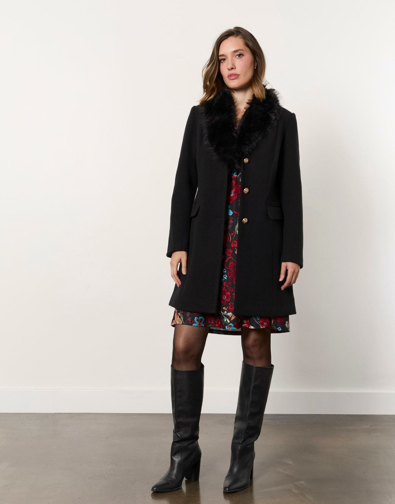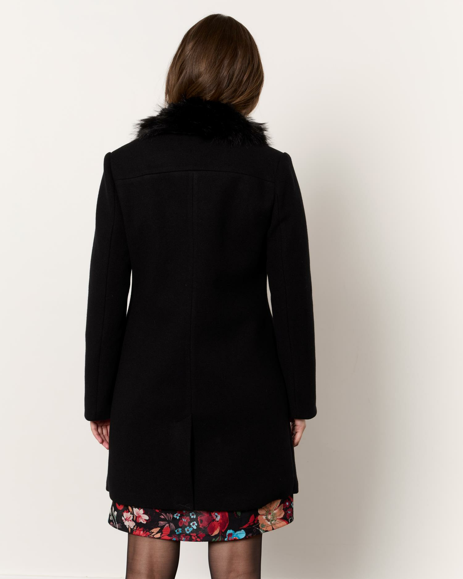 Manteau longueur genoux uni noir pour femme, marque RIU Paris. Doublure fourreau, col tailleur, poches plaquées, fausse fourrure amovible, boutonnage central sur le devant.