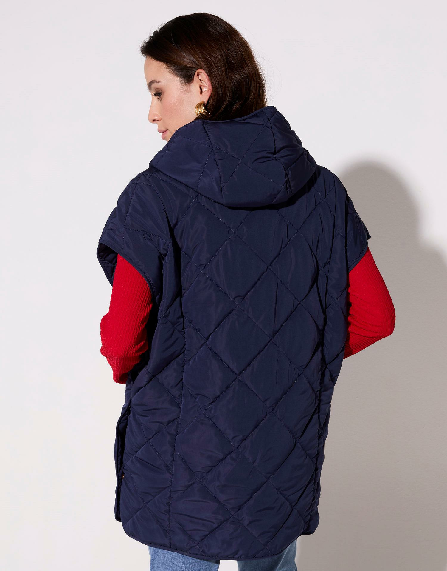 Matière matelassée, sans manches, capuche intégrée, fermeture zippée discrète. Disponible en taille S à L. Juliana mesure 1m72 et porte une taille S.