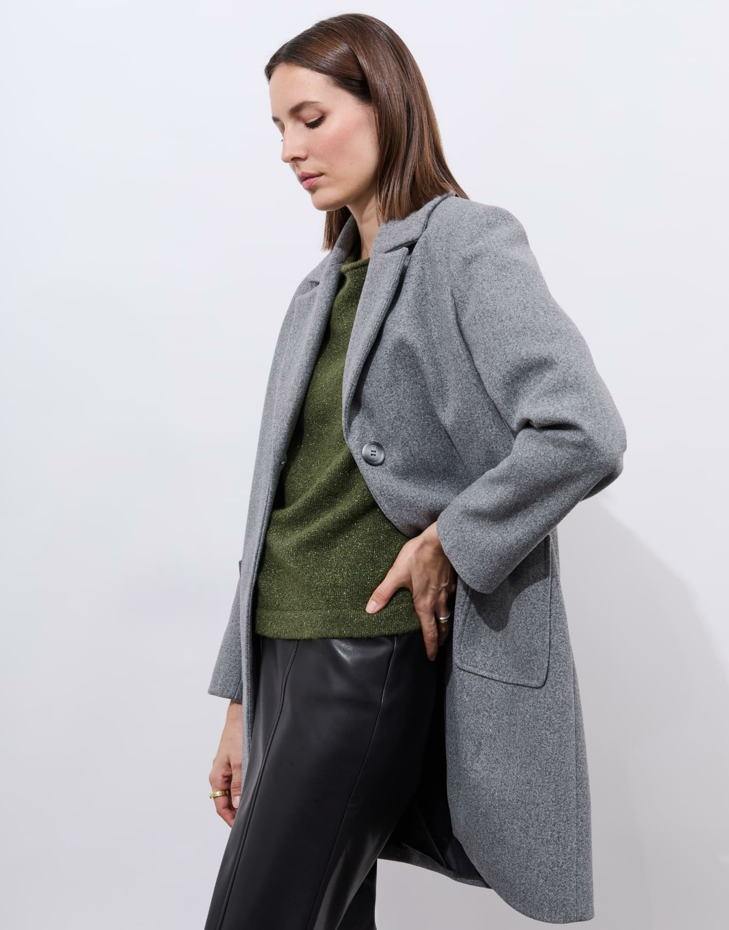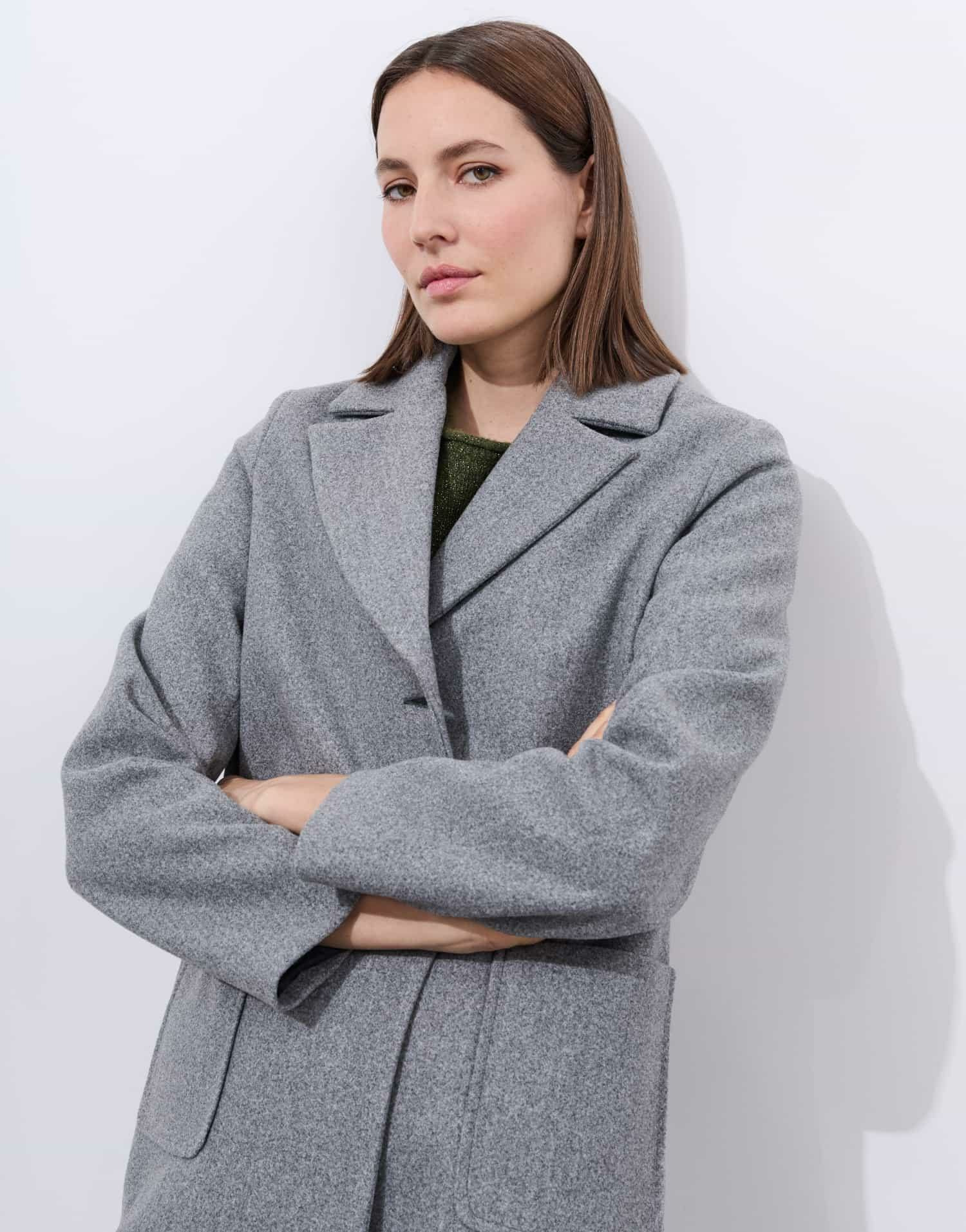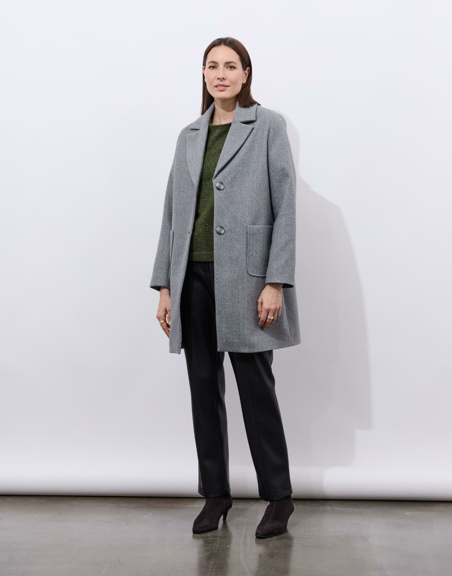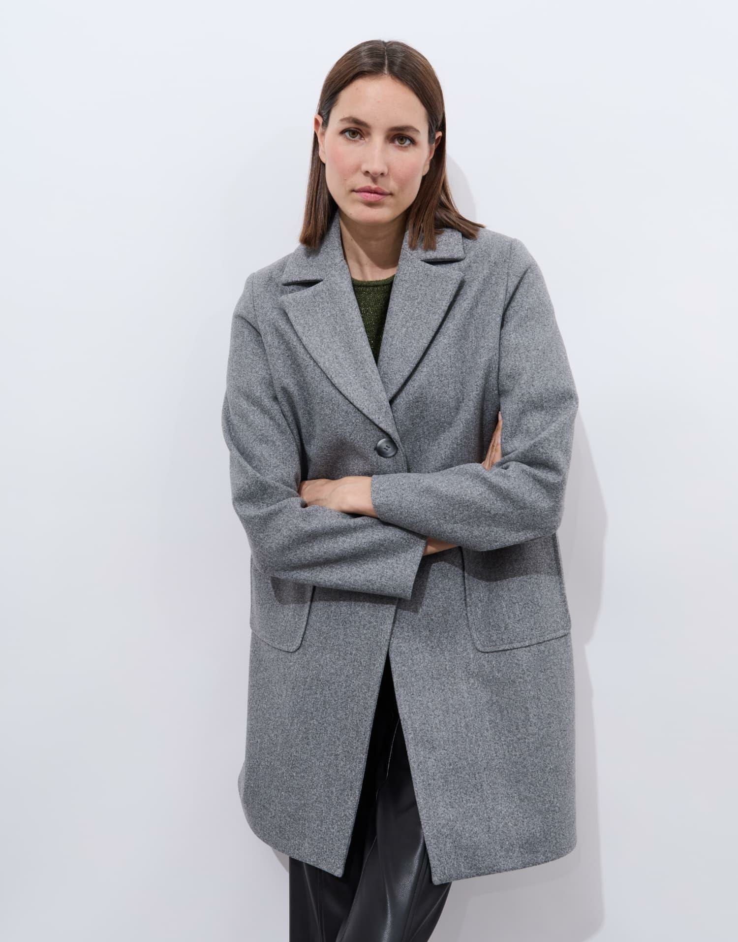 Longueur genoux de 95 cm, col tailleur, coupe droite. La mannequin mesure 1m75 et porte une taille 36. Coloris uni gris, matière non précisée.