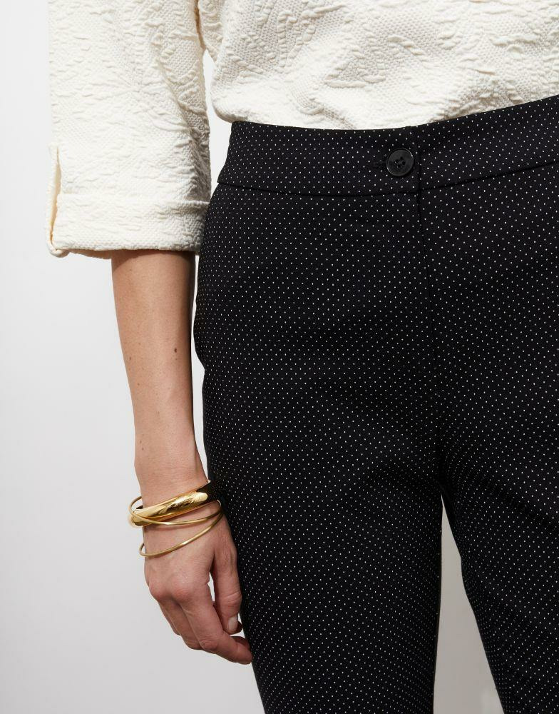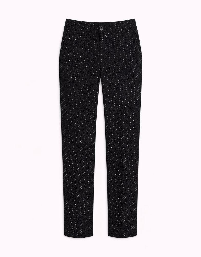Conçu pour les femmes qui recherchent un vêtement polyvalent, ce pantalon noir se prête aussi bien à un look professionnel qu’à une tenue plus décontractée. Le motif à pois subtil dynamise l’ensemble sans jamais alourdir, offrant une allure raffinée et facile à associer. Sa longueur 7/8 met en valeur les chevilles, parfaite pour révéler vos chaussures préférées.