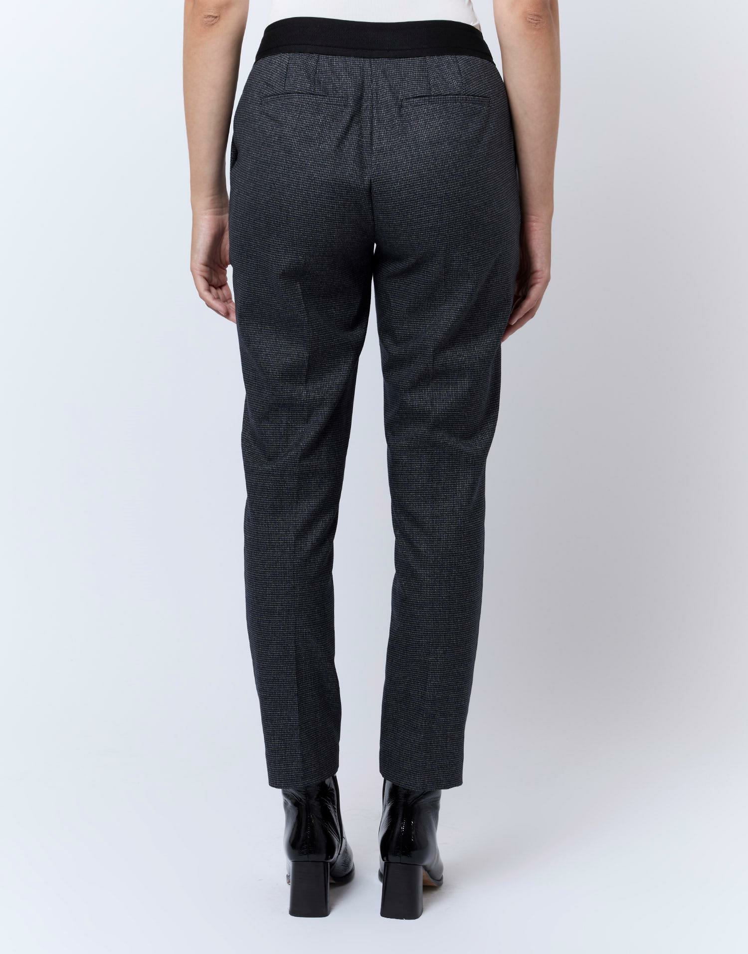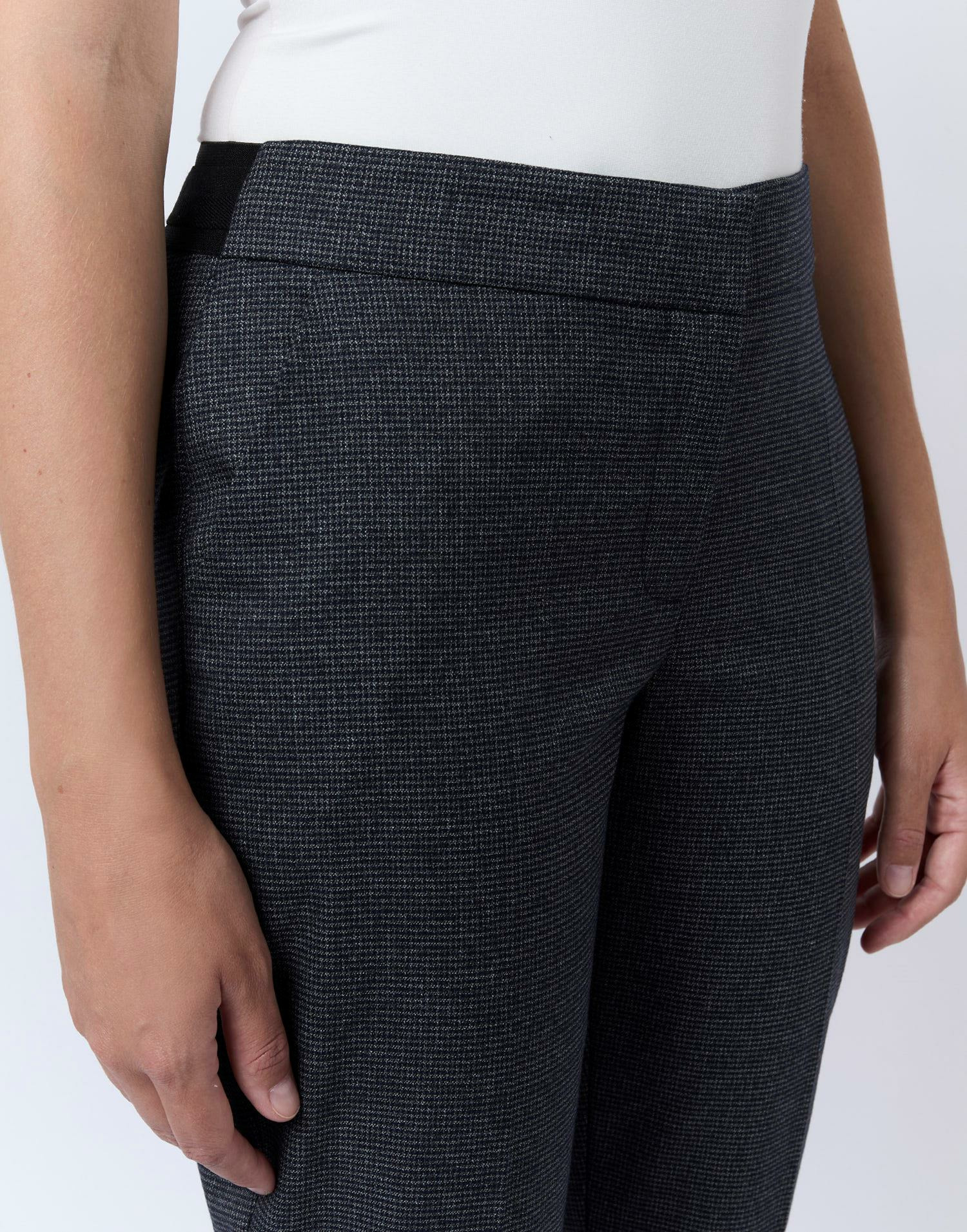 Taille disponible : 38 portée par Manon (1m75). Coupe cigarette 7/8. Motif pied de puce marine. Taille élastique. Poches avant et poches plaquées arrière.