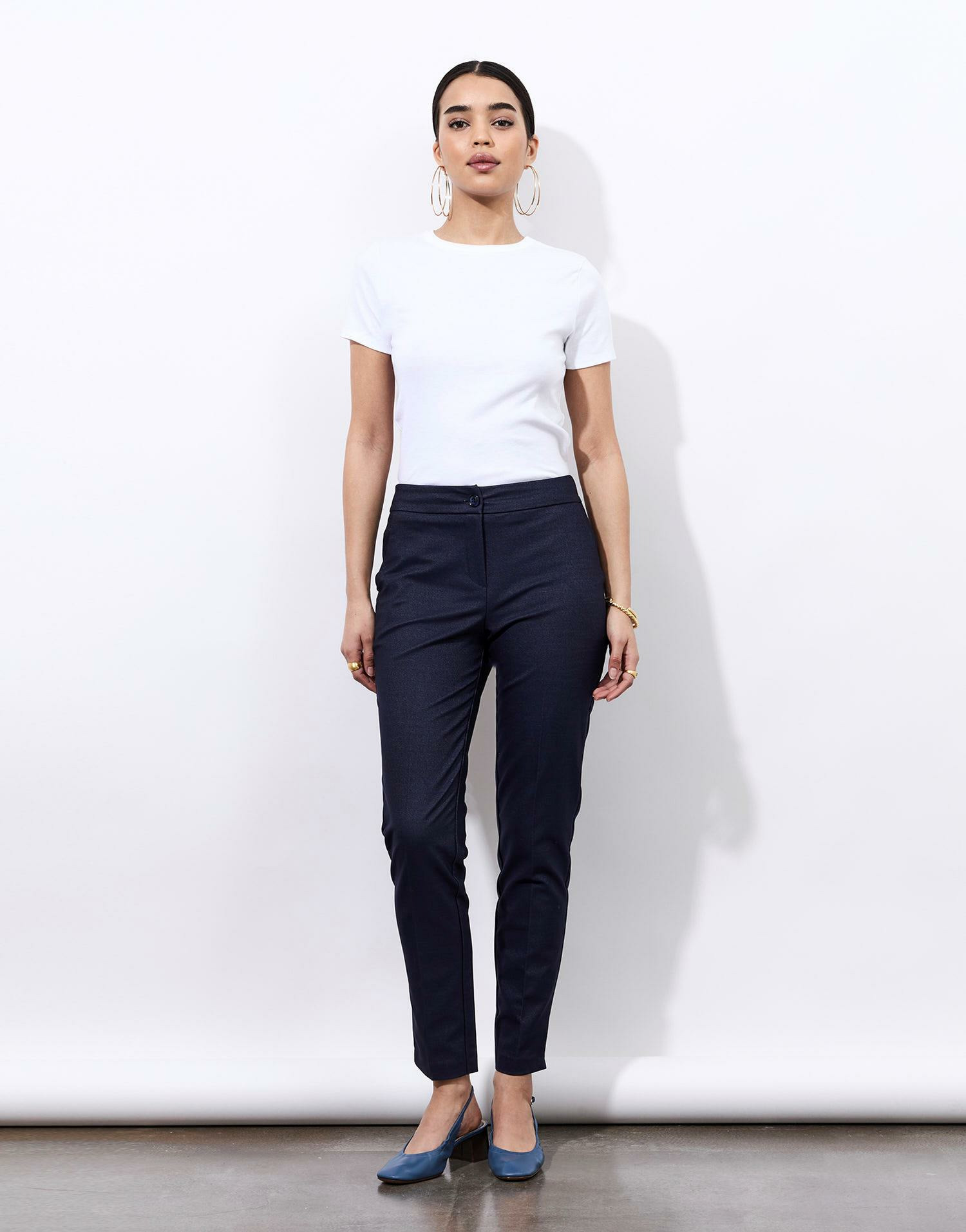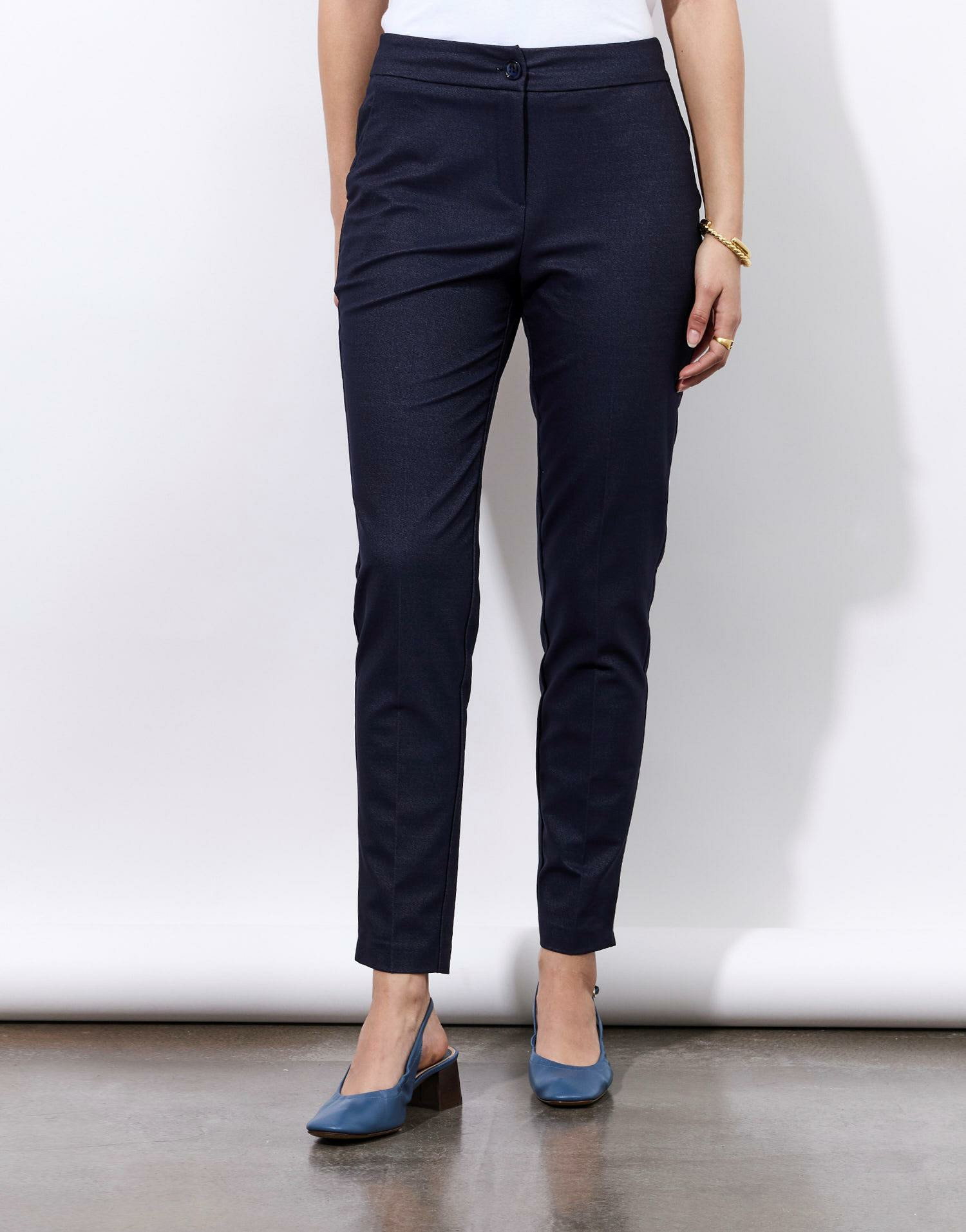 Taille ajustée, fermeture boutonnée à la taille, poches latérales discrètes. Longueur 7/8, coupe cigarette. Matière : faux denim. La mannequin mesure 1m75 et porte une taille 38.