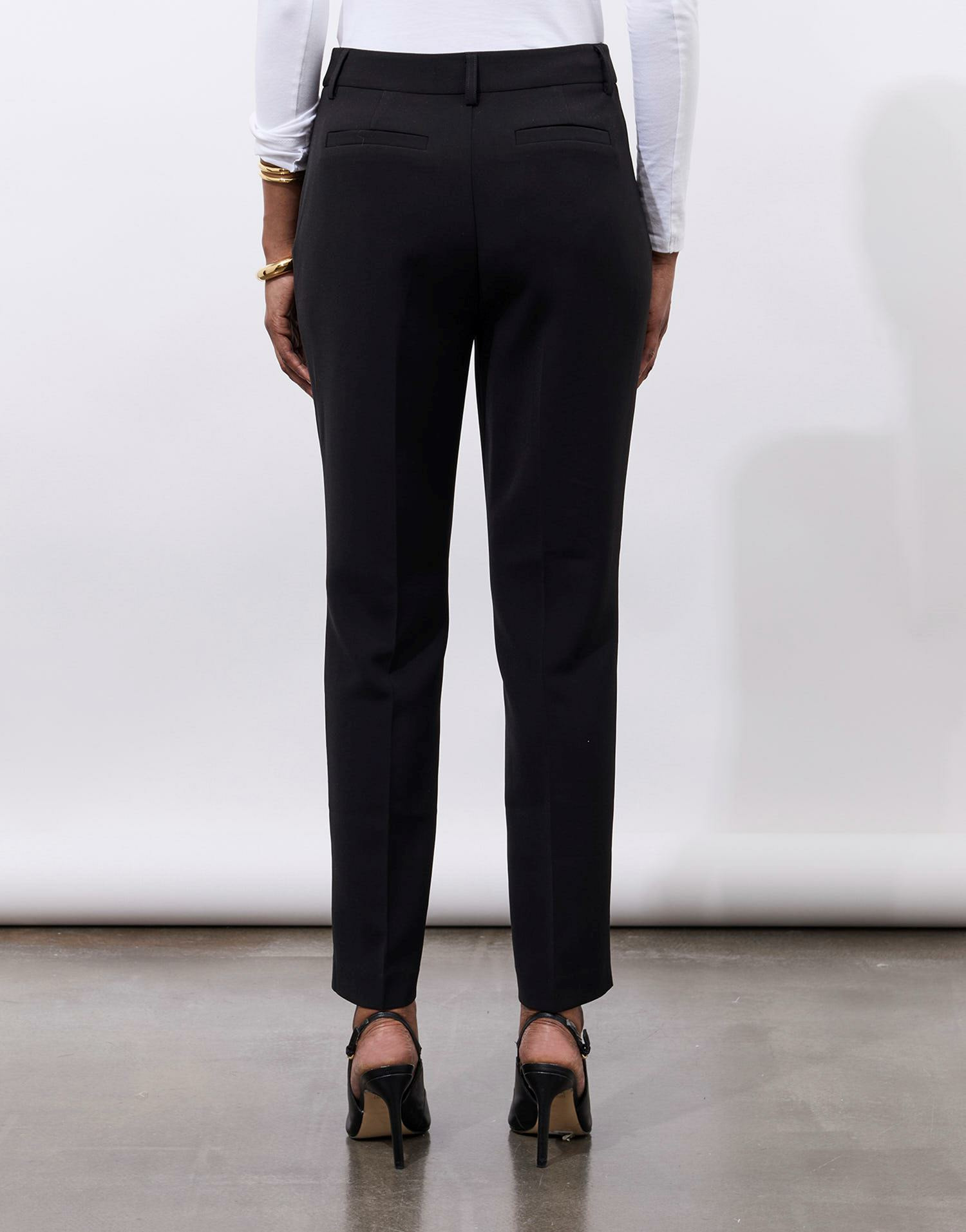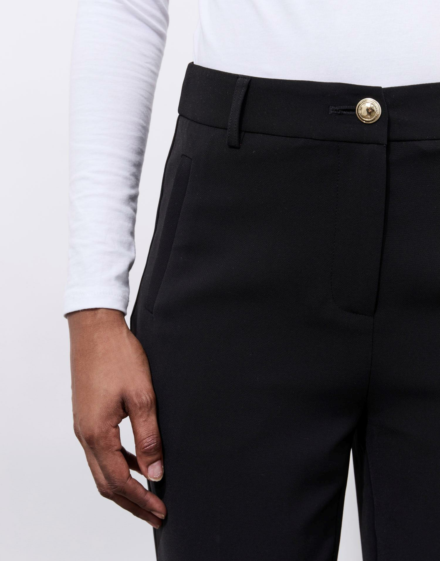 Disponible en taille 38 portée par une mannequin de 1m75, ce pantalon présente une coupe ajustée avec poches passepoilées. Sa longueur 7/8 et sa teinte noire unie en font un basique indispensable.