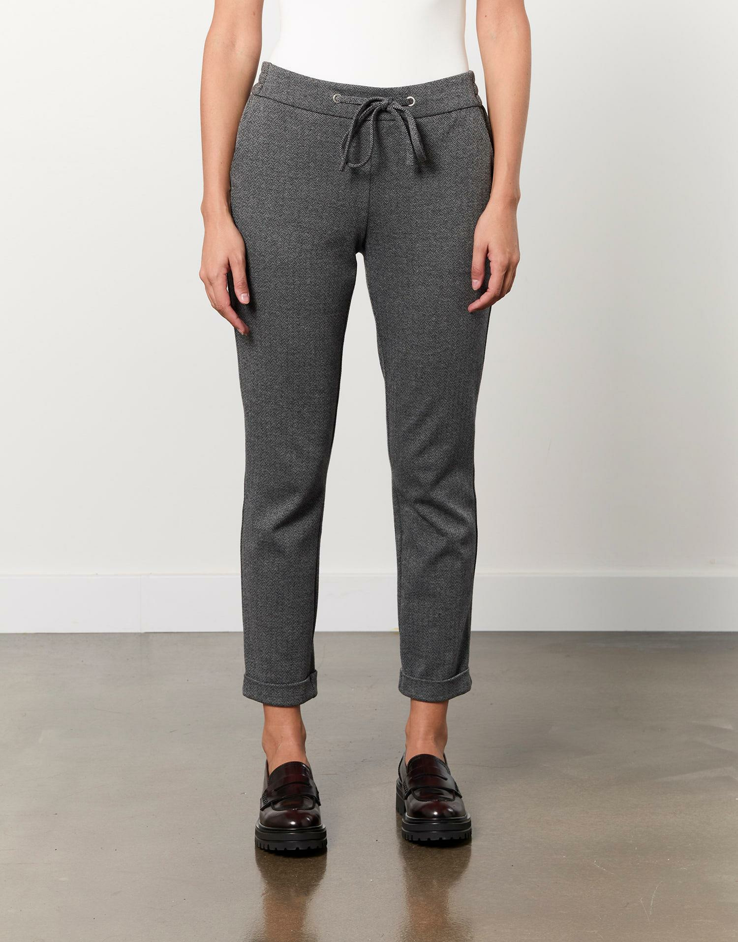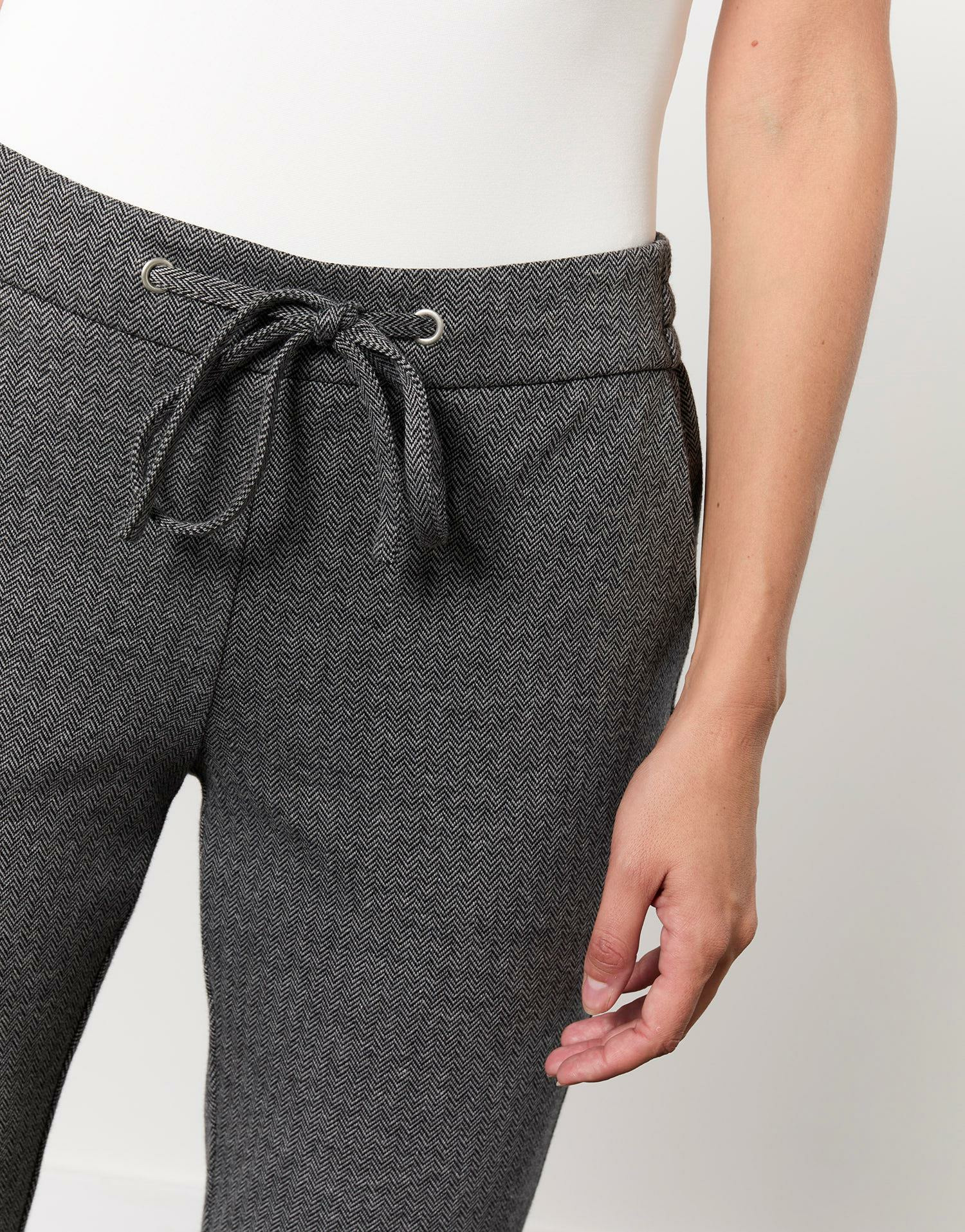 Taille élastiquée pour un ajustement parfait. Coupe fuselée 7/8 qui met en valeur la cheville. Motif chevron discret en anthracite. Julie mesure 1m78 et porte une taille 38.