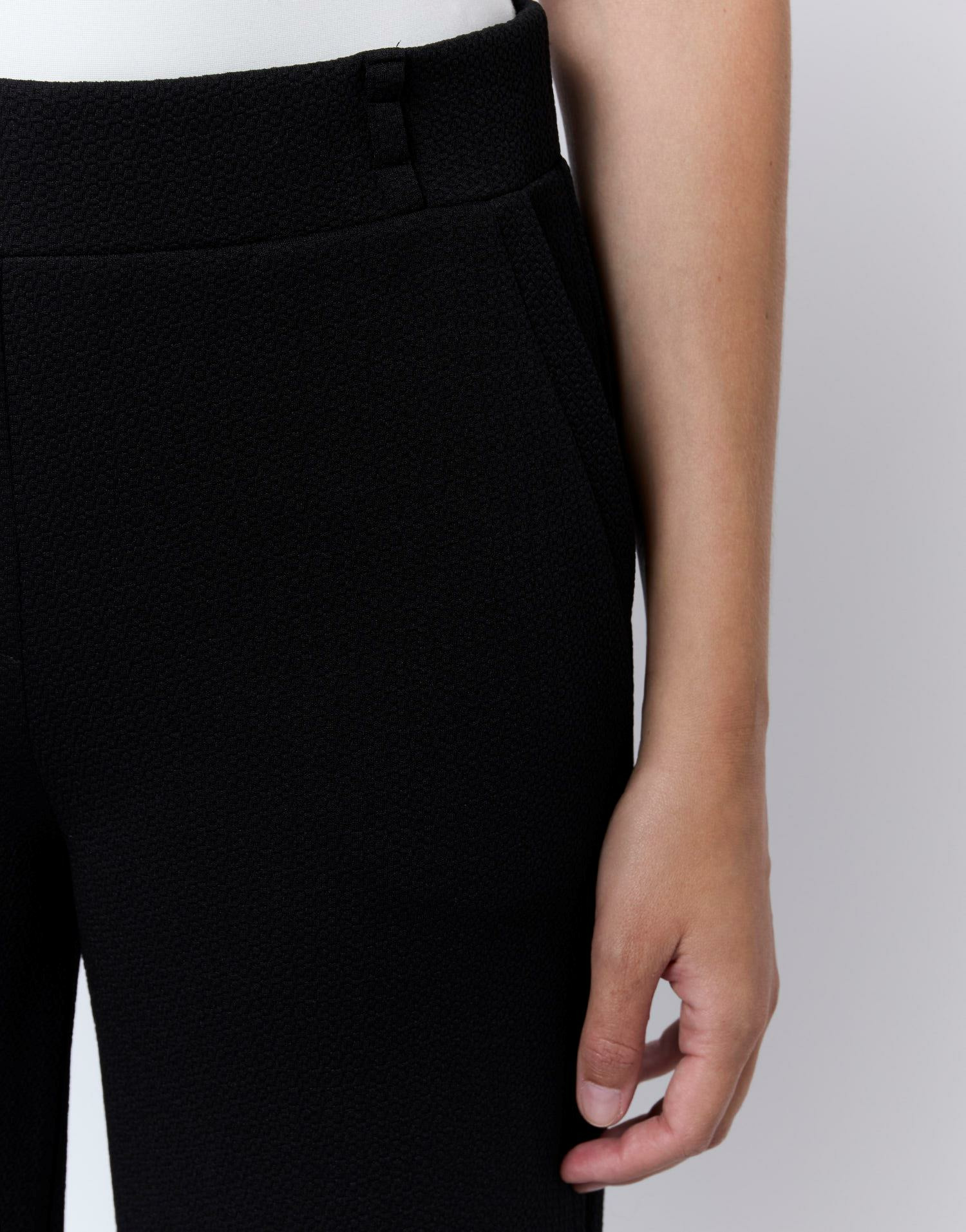 Fabriqué dans une matière fluide et légère, ce pantalon présente une taille élastiquée pour un ajustement parfait. Sa coupe 7/8 large met en valeur la cheville, tandis que sa teinte noire unie s’adapte à toutes les occasions.