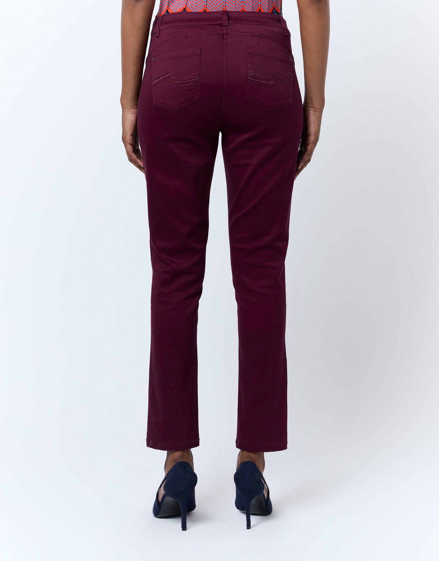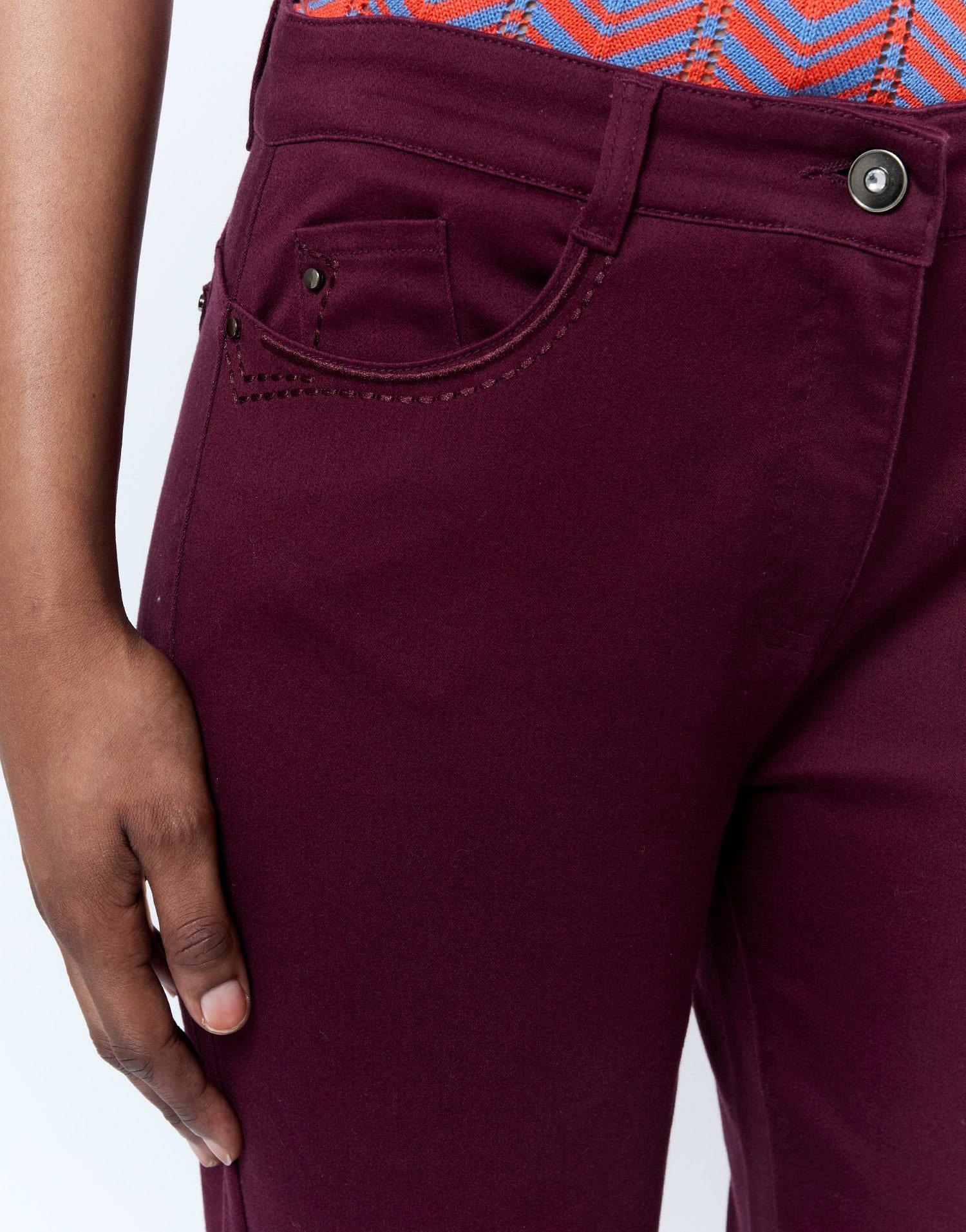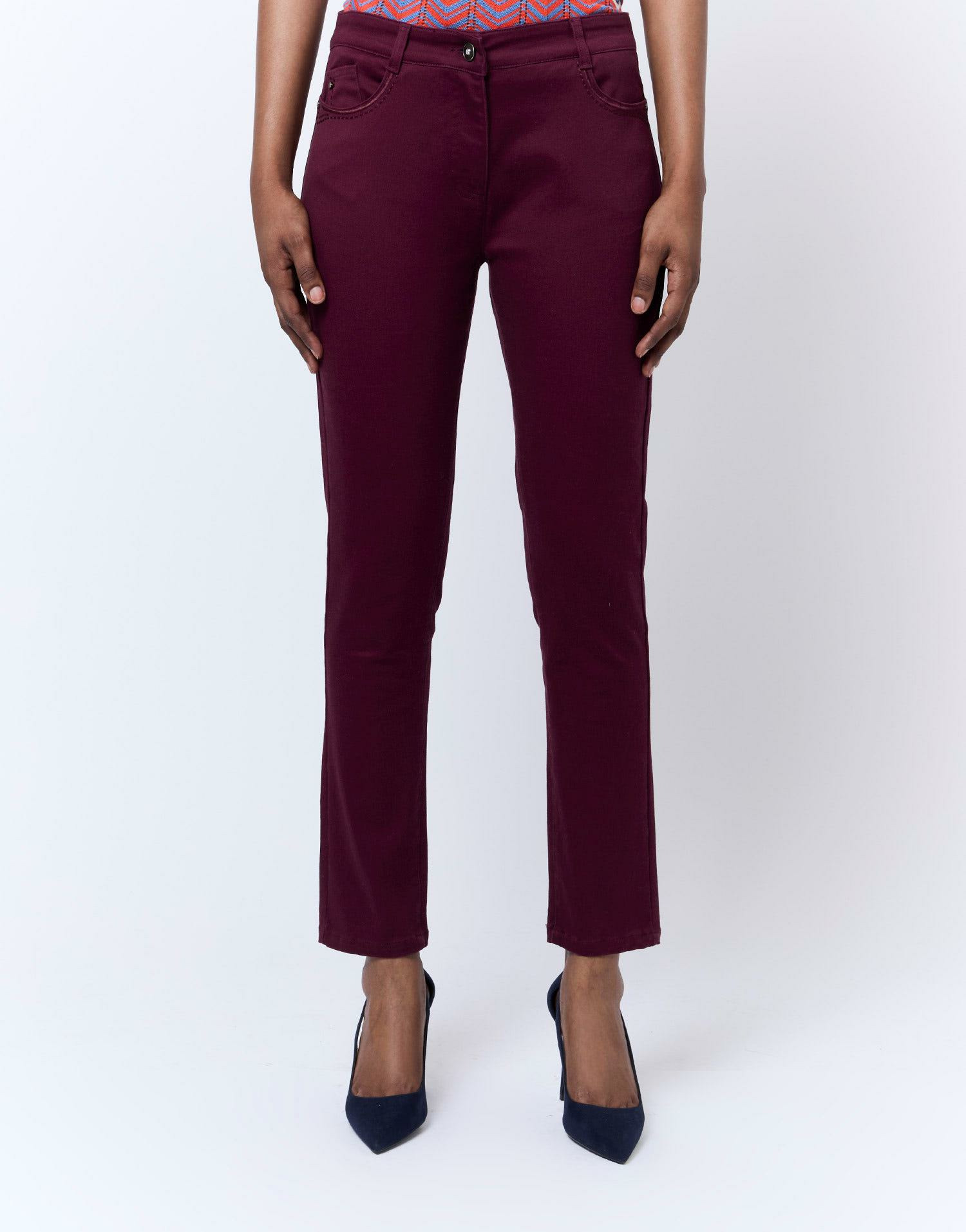 Affirmez votre style avec ce pantalon 7/8 slim aubergine, une pièce essentielle pour une allure moderne et sophistiquée. Sa coupe ajustée et sa teinte profonde subliment toutes vos tenues avec élégance.