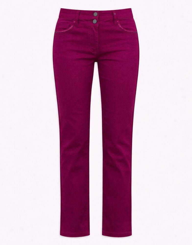 Affirmez votre style avec ce pantalon 7/8 slim aubergine, subtilement rehaussé d’un liseré à sequins qui capte la lumière. Une pièce élégante et moderne, pensée pour sublimer votre silhouette au quotidien.